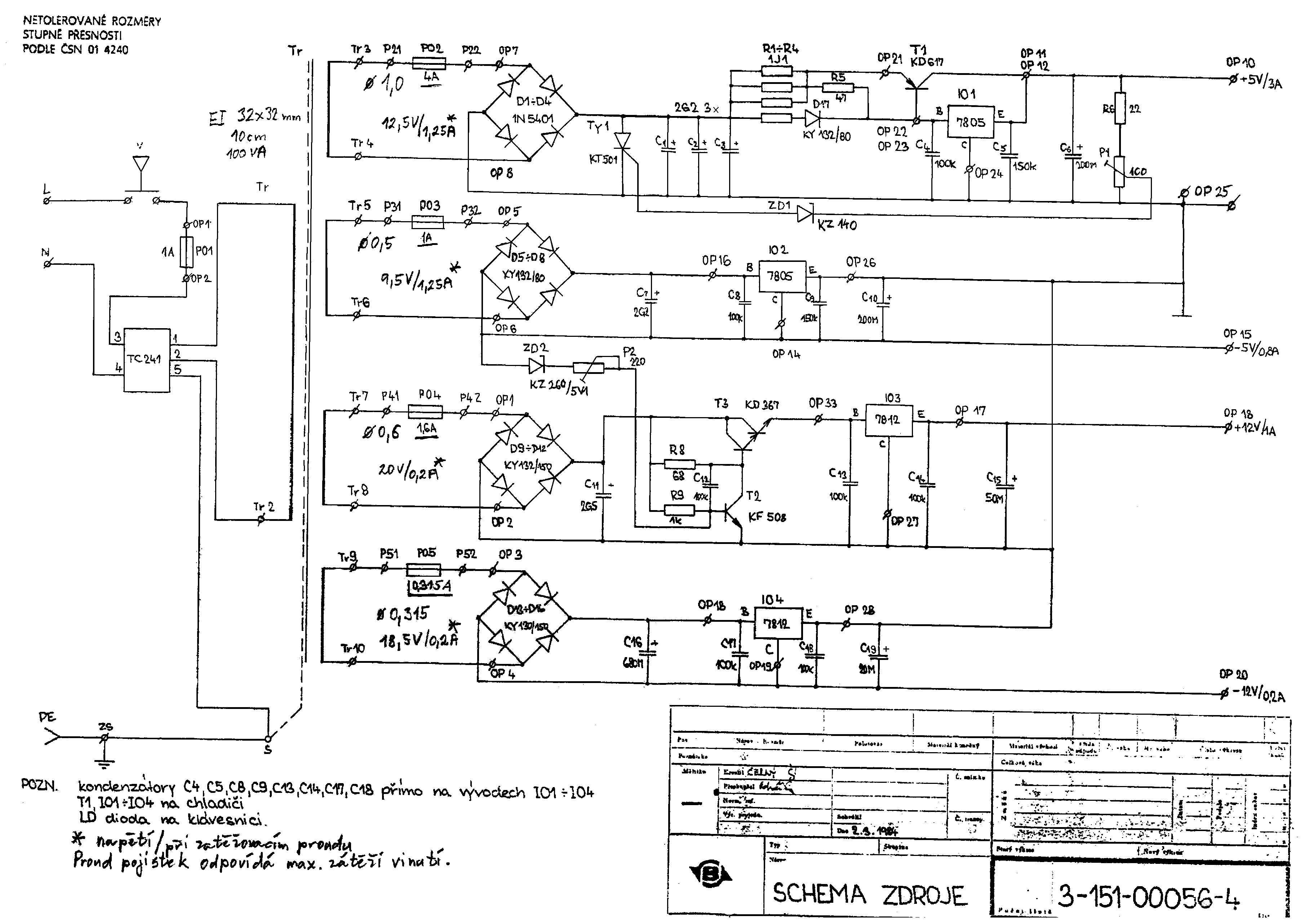 Sillicon si dal tu práci a vyčistil schéma zdroje do použitelné podoby. Jedna se o schéma starší verze zdroje, rozdíl mezi starší a novější verzi by mněl být pouze ve výměně diod 1N5401 za KY708 a tyristoru KT501 za KT701.