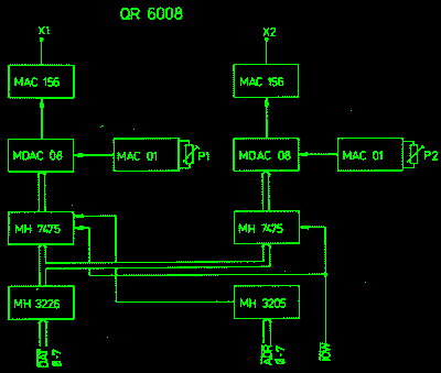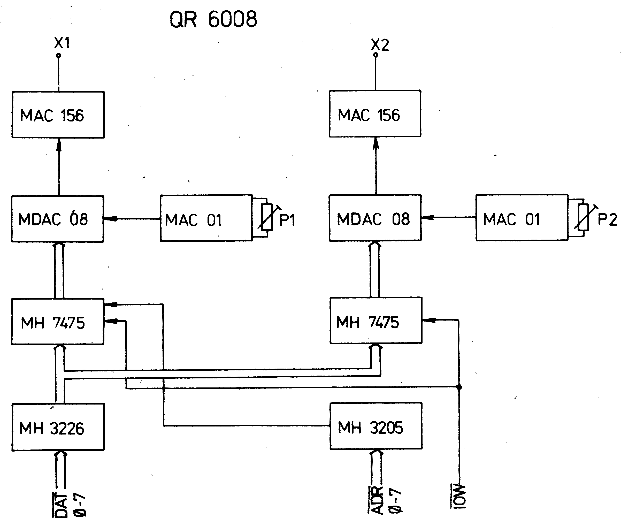 Modul DAC obsahuje dva osmibitové číslicově - analogové převodníky. Výstupní signály obou převodníků jsou vyvedeny konektory na dílčím panelu jednotky. Převodníky převádí osmibitové číslo v přímém binárním kódu na napěťový výstupní signál v rozmezí 0 až 10V, 0 až 20mA. Informace určena k DA převodu se odešle pomocí instrukce OUT nn do výstupního adresového registru funkční jednotky, kde je držena tak dlouho, pokud nedojde k jejímu přepisu informací novou. Umístění funkční jednotky v množině adres se provede v propojovacích polích dekodéru adres J1 a J2. Potenciometry P1 a P2 slouží k přesnému nastavení výstupního napěťového rozsahu převodníků. Od datové systémové sběrnice je jednoka oddělena obousměrnými budiči sběrnic s třístavovým výstupem. Použitý řídící signál IOW.