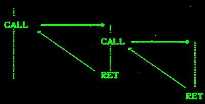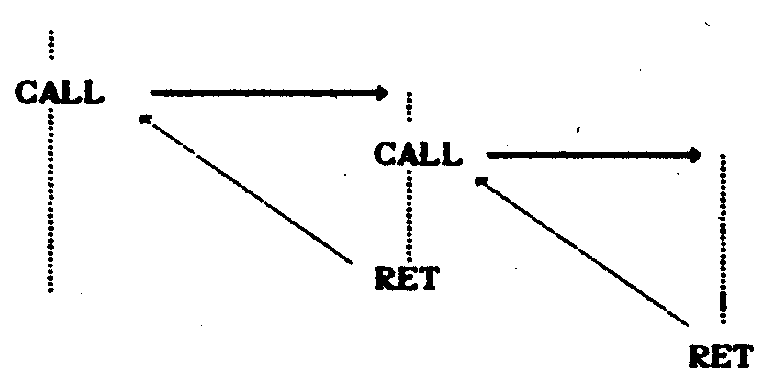 Jinou důležitou částí procesoru je zásobník. Je to vlastně vnitřní paměť procesoru určená pro čtení i zápis (RWM - Read Write Memory). Zásobník mikropočítače PETR má 10 položek a slouží pro ukládání návratových adres při volání podprogramů. Se zásobníkem pracují výhradně instrukce CALL (volání podprogramu) a RET (návrat z podprogramu). Pro potřeby ladění programu lze zobrazovat ukazovátko do zásobníku SP (Stack Pointer). Pro prázdný zásobník je SP=0. Závěrem připomeňme ještě princip využívání zásobníku, který je obdobný u většiny mikropočítačů. Zásobník pracuje systémem poslední (zapsaná návratová adresa) dovnitř - první ven (LIFO Last-In-First-Out). Tento princip umožňuje postupné vnořování jednoho podprogramu do druhého a je znázorněn na obr. 1.
