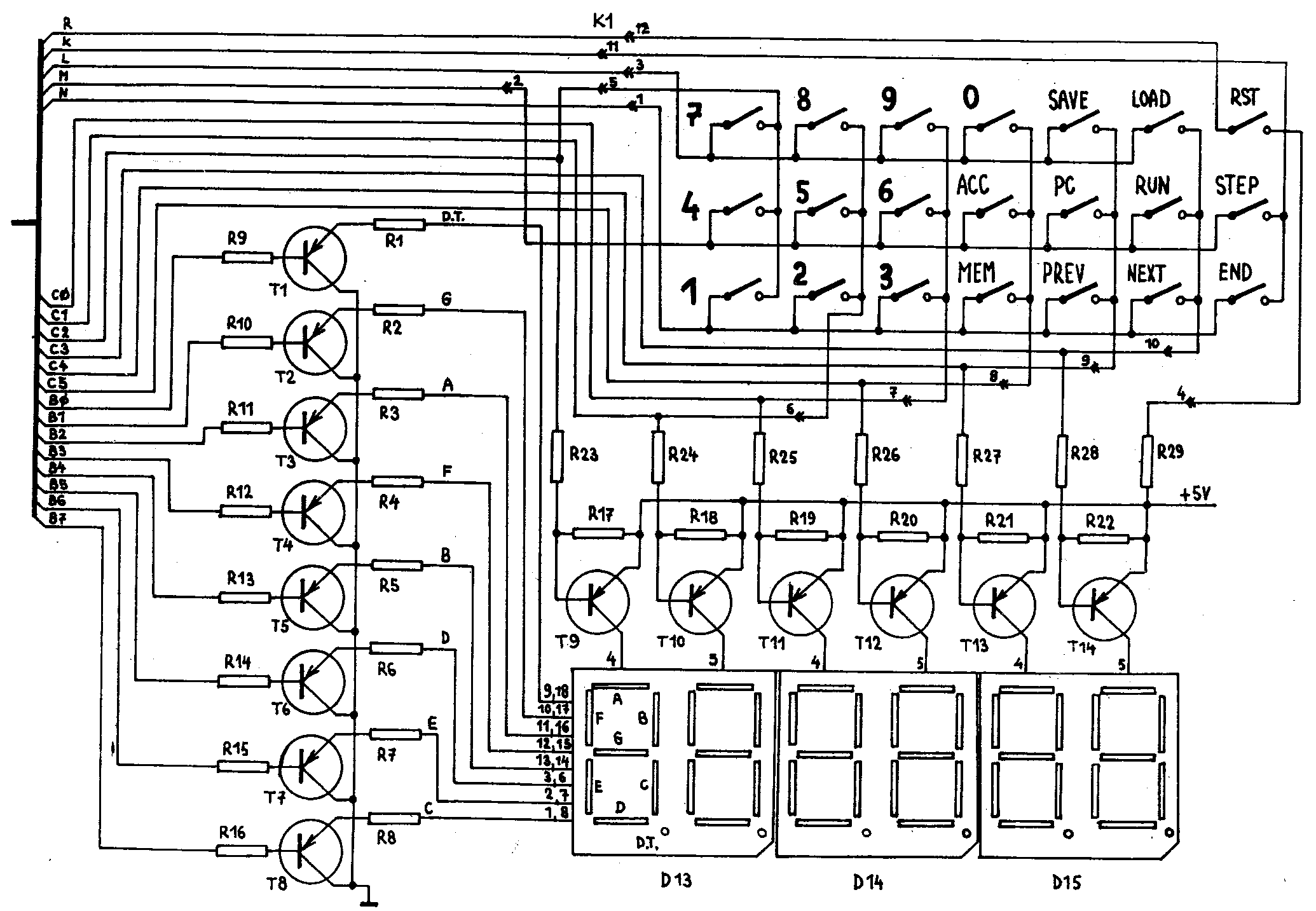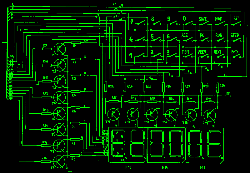 Ke styku s obsluhou slouží membránová klávesnice a sedmi- segmentový displej. Instrukční soubor umožňuje snímat stav klávesnice a ovládat všechny segmenty displeje. To znamená, že lze vytvářet programy, jejichž činnost může řídit obsluha tlačítky membránové klávesnice. Program přitom může své výsledky nebo zprávy zobrazovat na segmentový displej stavebnice. Tak lze například mikropočítačem PETR, snadno realizovat číslicový voltmetr, který má tlačítky přepínatelné rozsahy a další podobné aplikace.