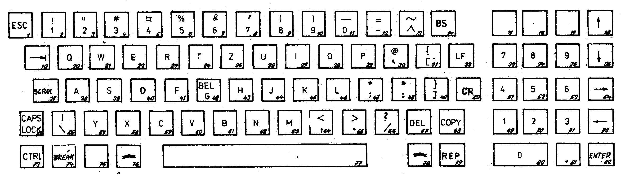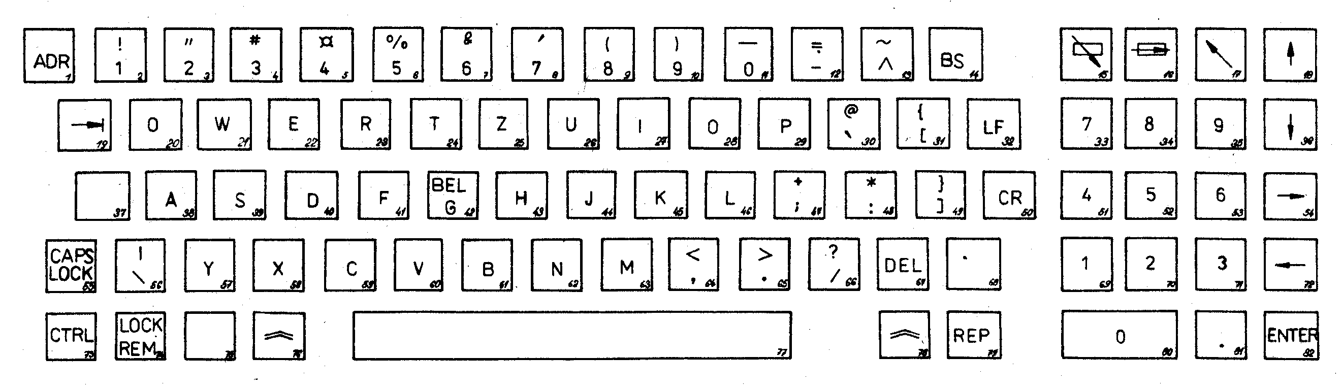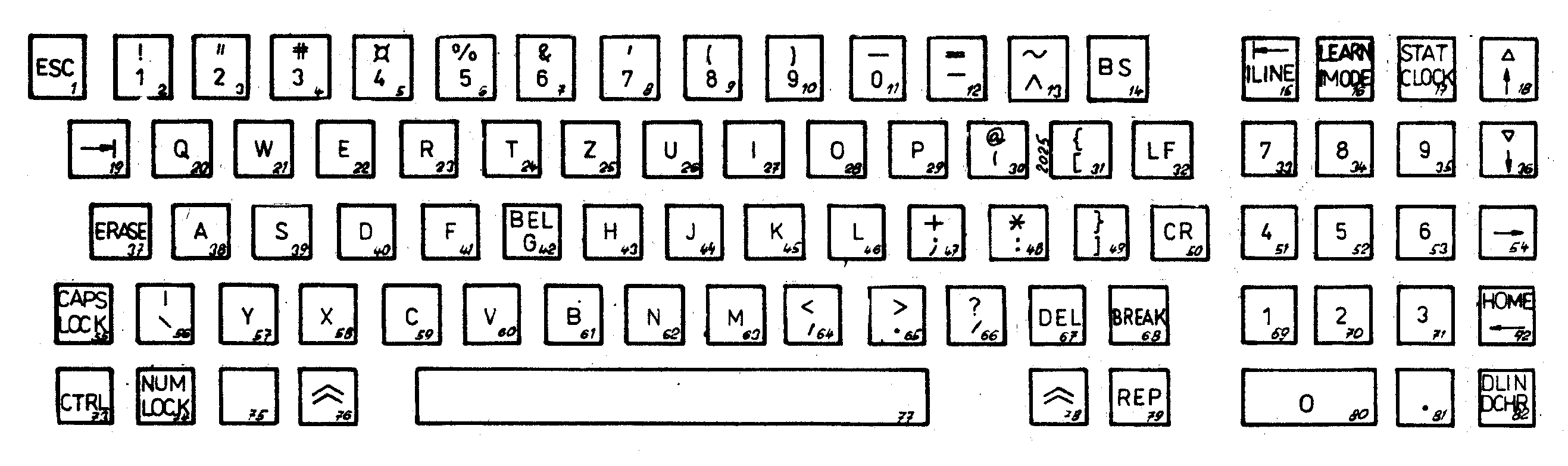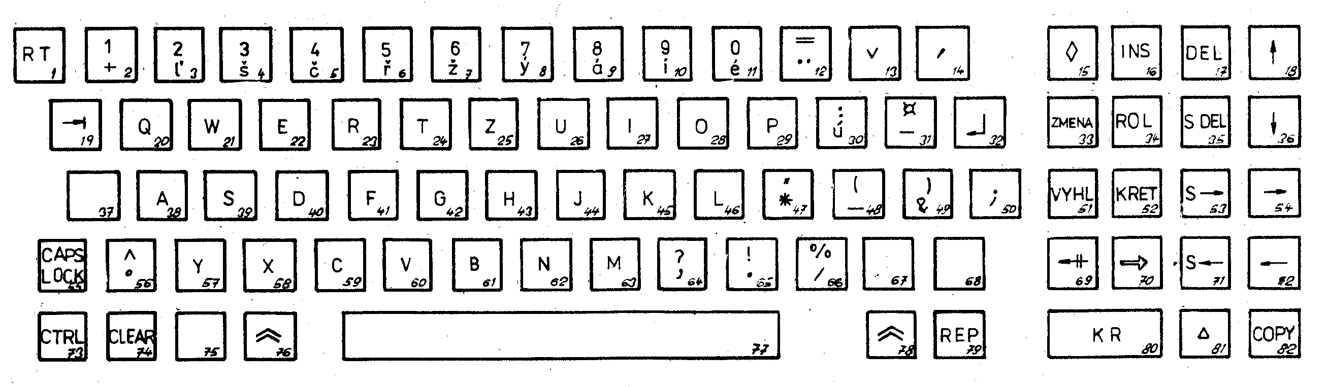 Tlačítka č. 1 - ESC, 14 - BACK SPACE, 19 - TAB, 32 - LINE FEED, 50 - CR, 67 - DELETE, 77 - SPACE (neoznačené tlačítko).