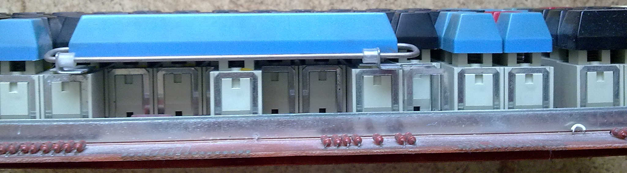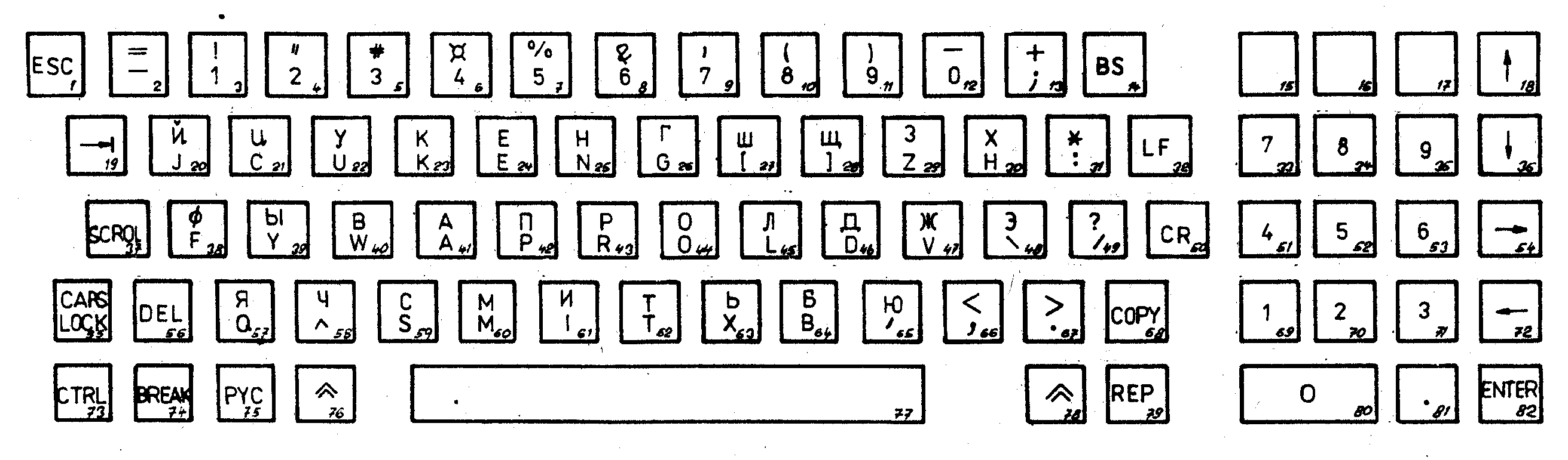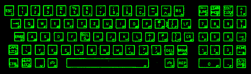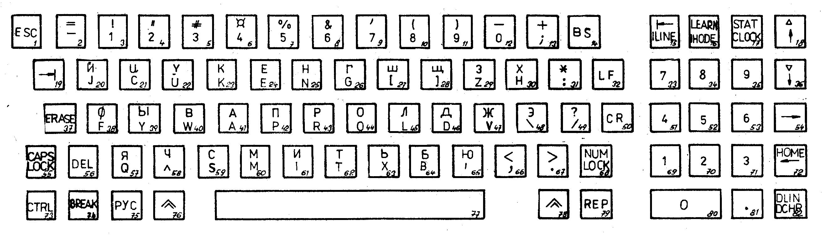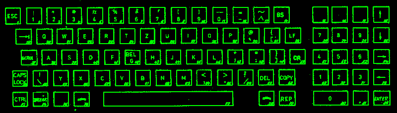 Tlačítka č. 1 - ESC, 14 - BACK SPACE, 19 - TAB, 32 - LINE FEED, 50 - CR, 67 - DELETE, 77 - SPACE (neoznačené tlačítko).