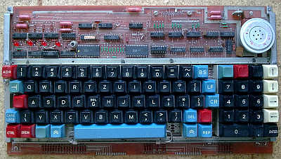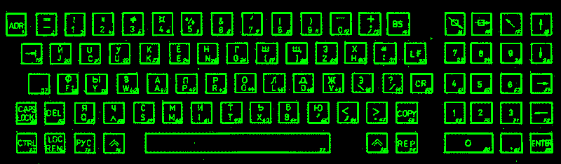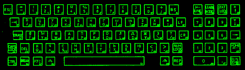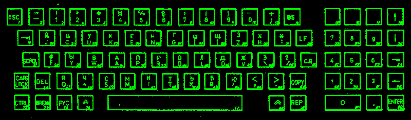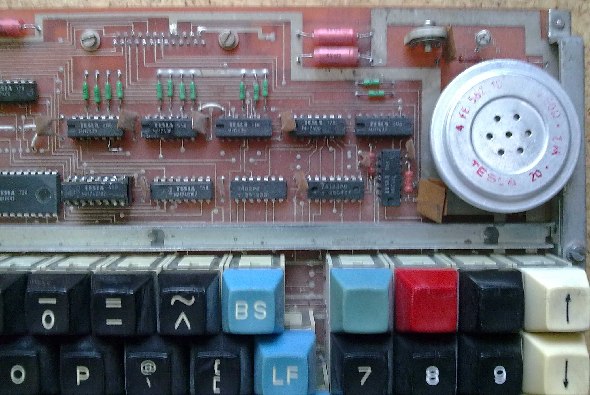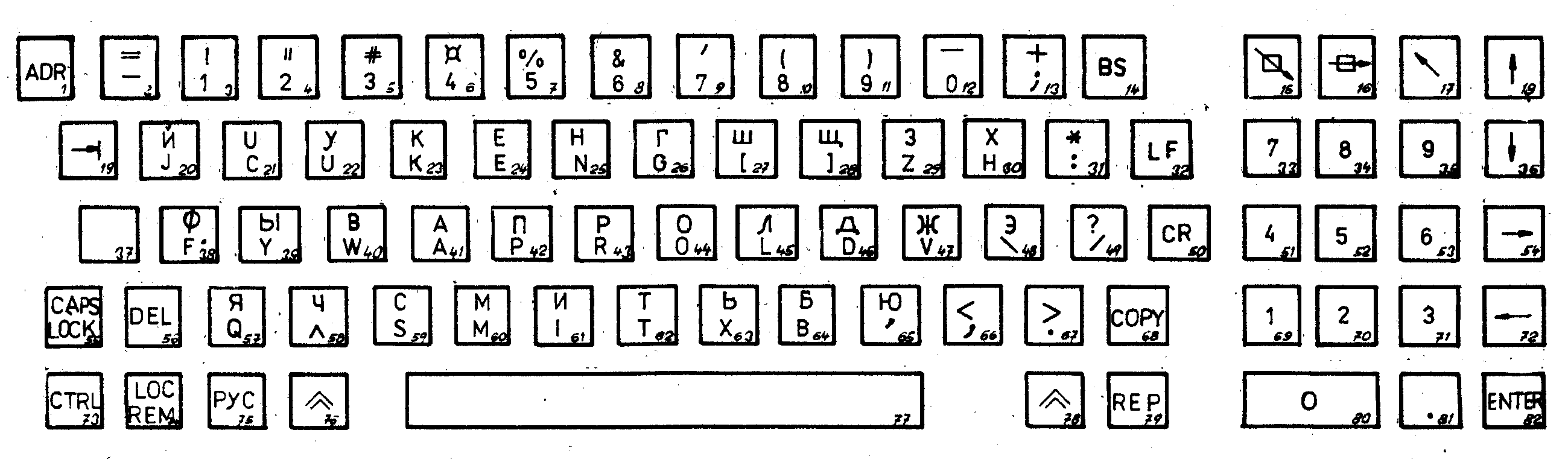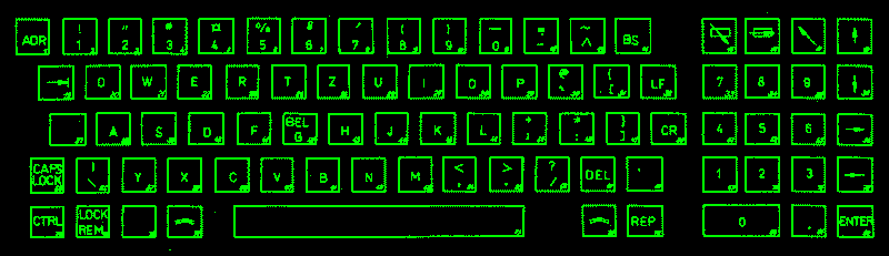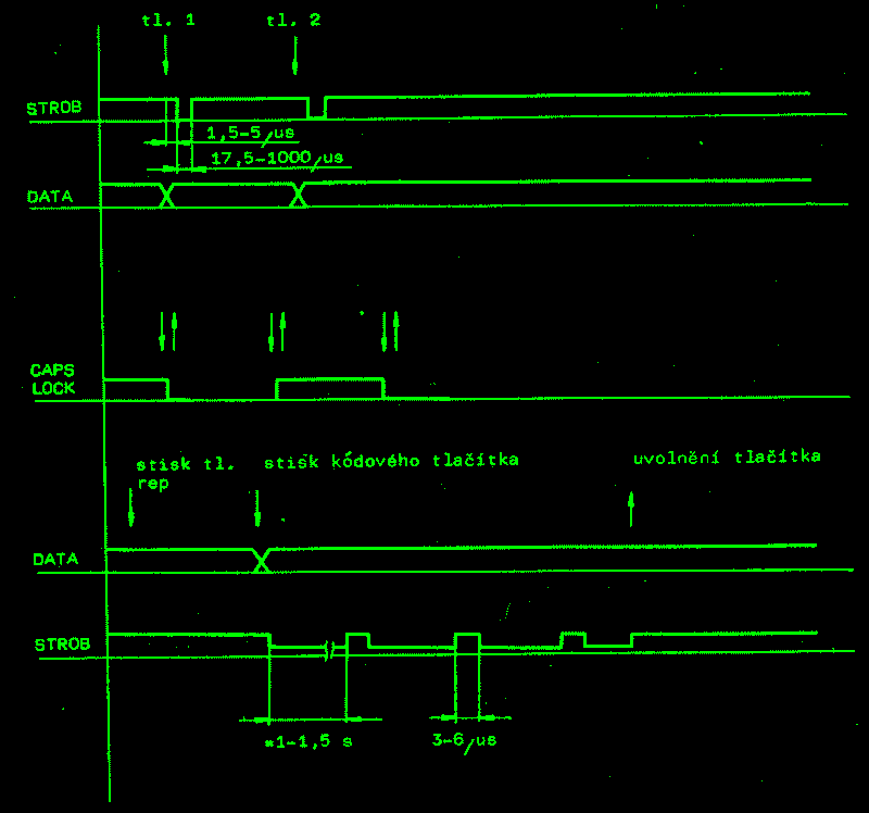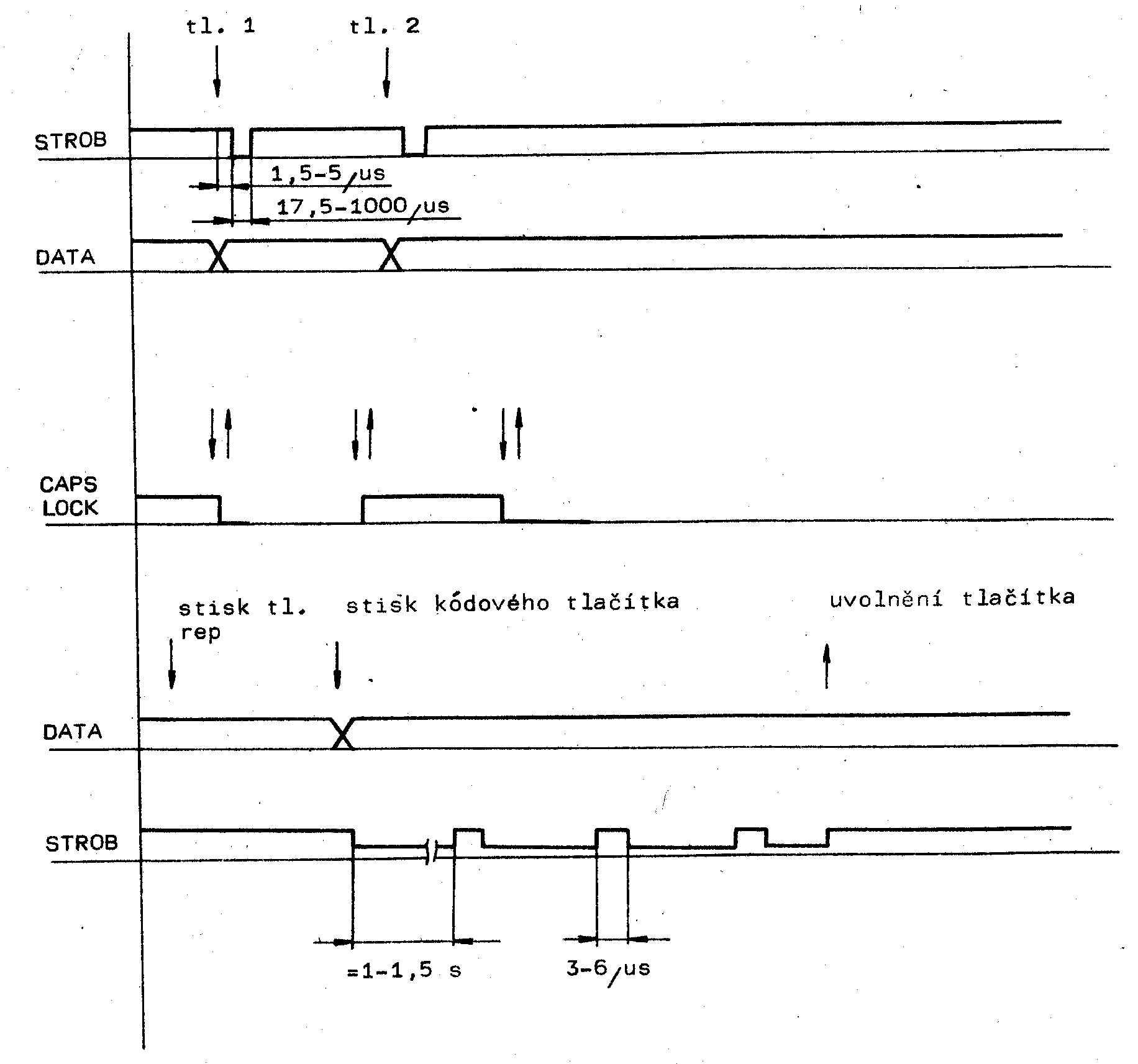 Stlačením některého z tlačítek č. 2 - 13, 20 - 31, 38 - 49, 57 - 67, 77 vznikne příslušný kód na výstupu klávesnice (signály BIT 1 - BIT 7) z kódové tabulky podle přílohy č. 16 a to velká písmena azbuky resp. znaky z dolní části butonů tlačítek se dvěma znaky. Současně se generuje signál "STROB" (po dobu 17,5 - 1000 µs viz časový diagram - příloha č. 11). Stav signálu BIT K je klidový.