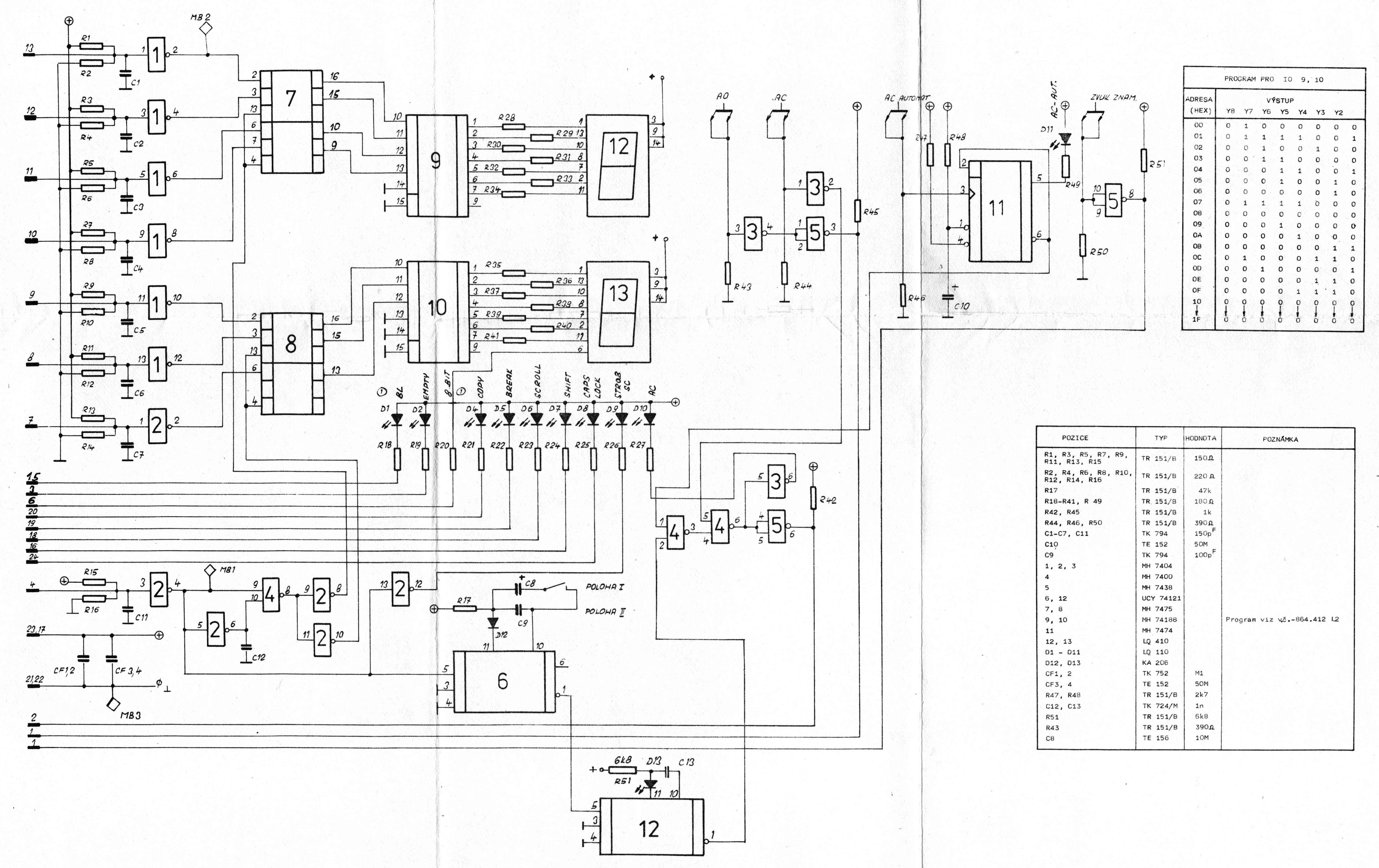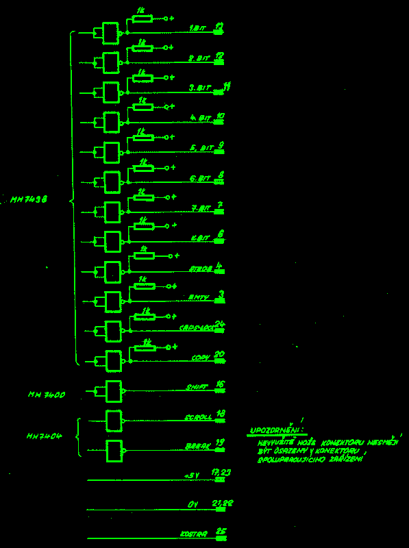 Tlačítka č. 15 - 18, 33 - 36, 51 - 54, 69 - 72, 80 - 82. Po stlačení některých z těchto tlačítek generuje se kód podle kódové tabulky - příloha č. 8 a 9 (signály BIT 1 - BIT 7) a současně se generuji signály "STROB" a BIT K (signál "STROB" tehdy, až jsou signály BIT 1 - BIT 7 a BIT K ustálené). Kódy těchto tlačítek nejsou ovlivňovány tlačítky č. 76 a 78 (SHIFT), 55 (CAPS LOCK), resp. 73 (STRL).