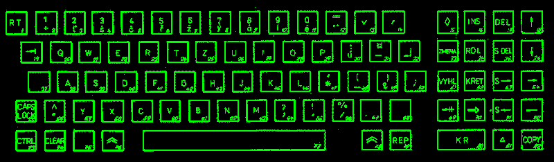 Stlačením klávesy CAPS LOCK (uvedeni do aretované polohy) a následné stlačení některé z kláves č. 20 - 30, 38 - 48, 57 - 65 způsobí generování kódu ze 4. a 5. sloupce kódové tabulky přílohy 8, 9, 10 základního klávesového pole.