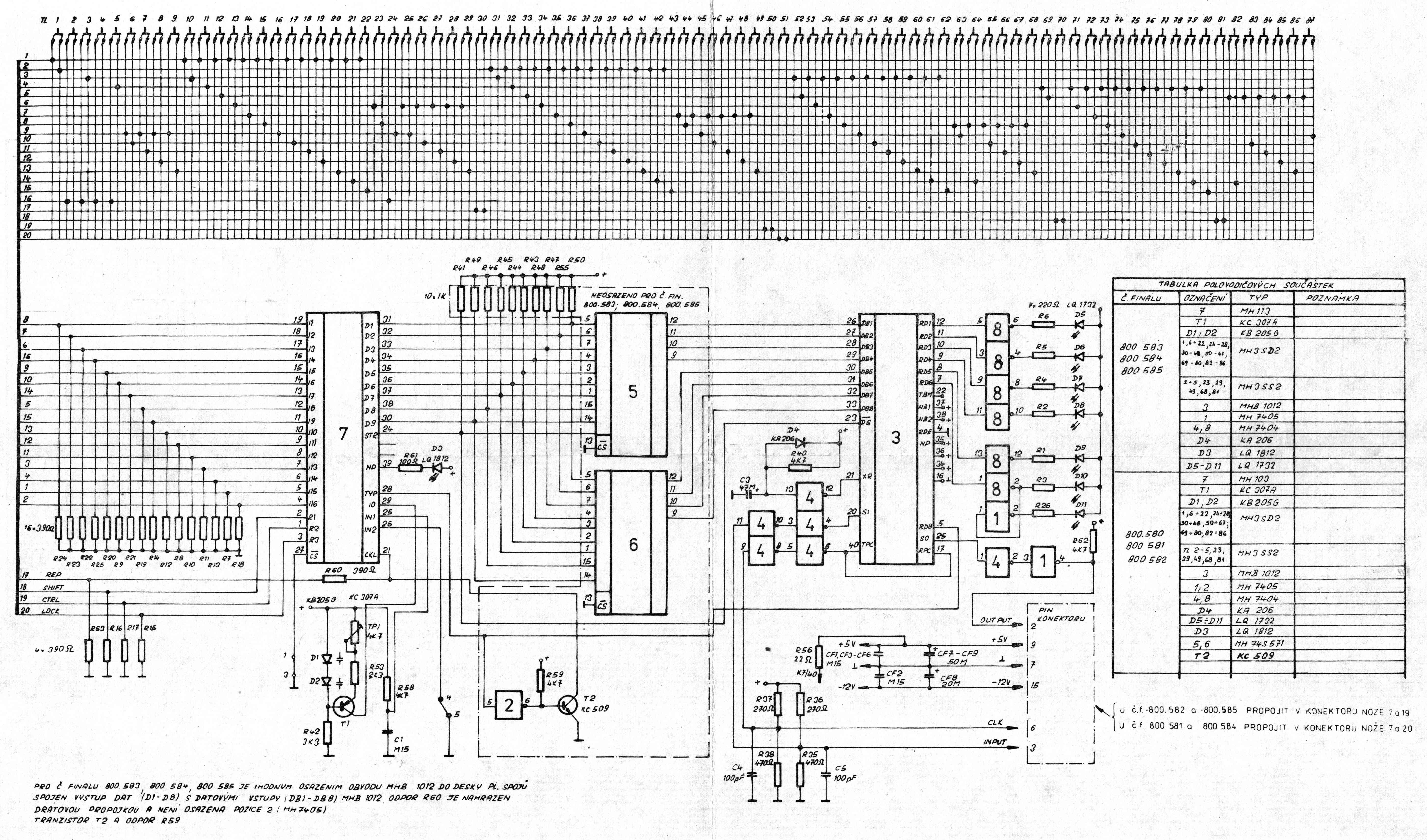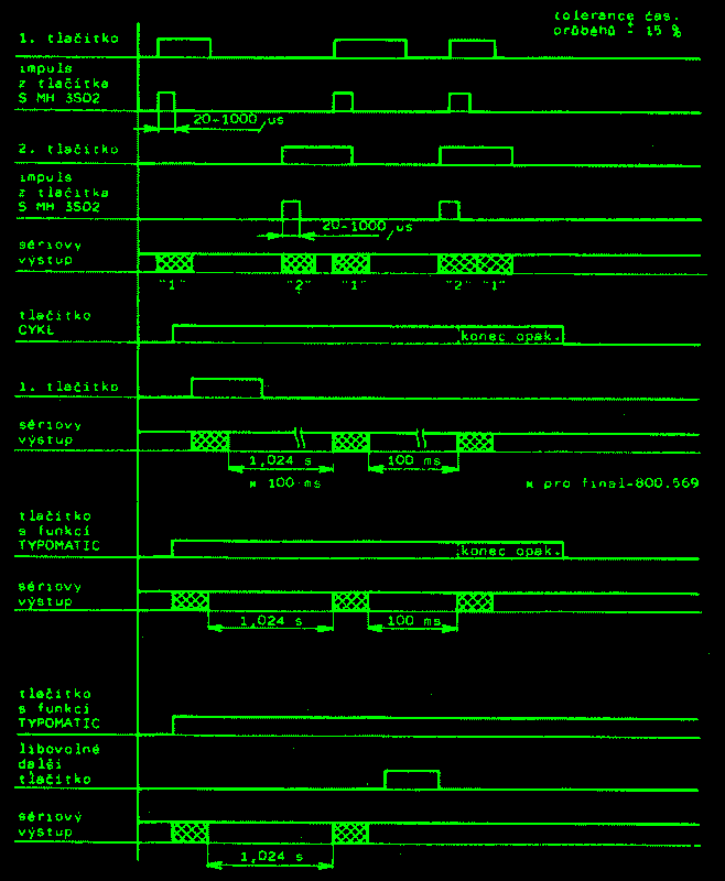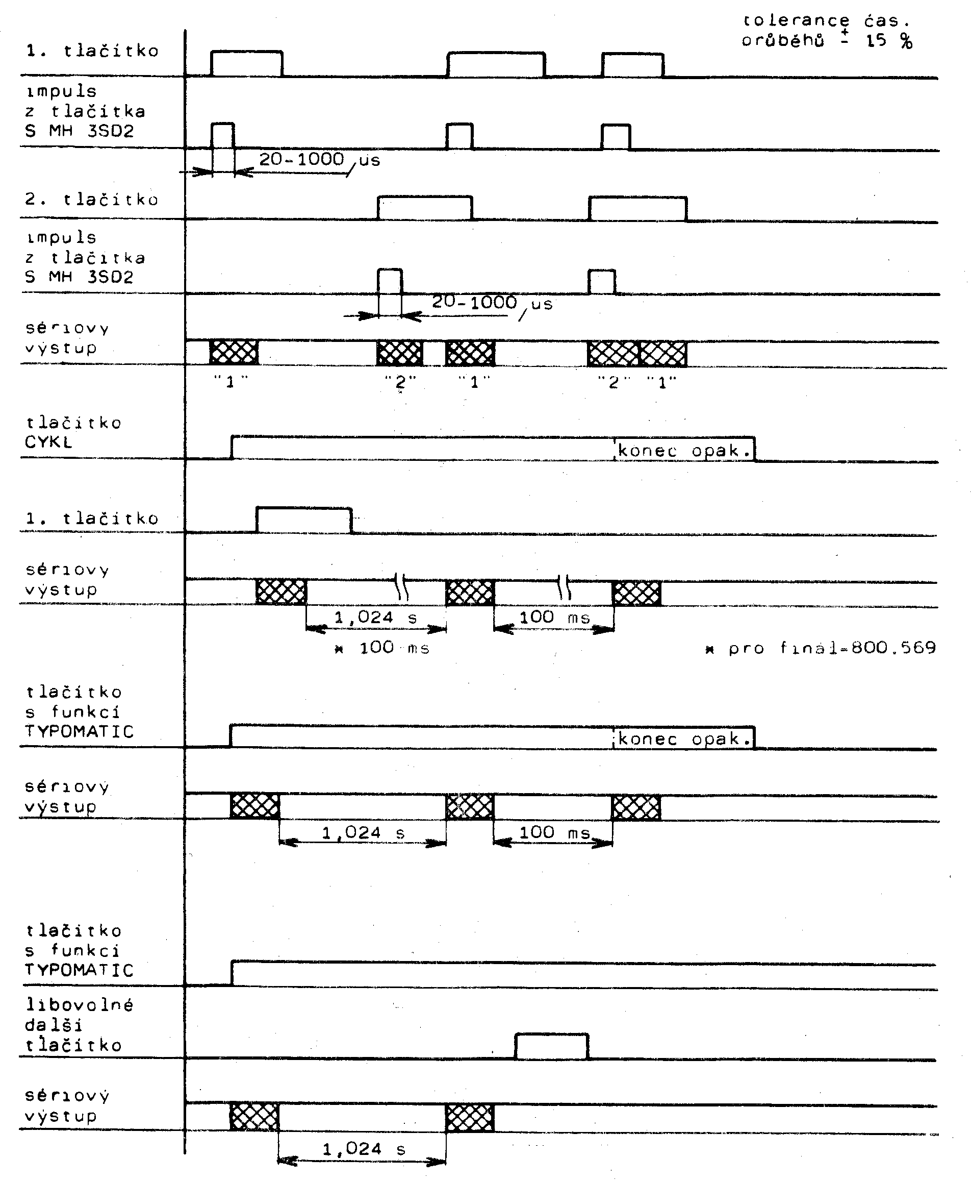 Tlačítka jsou zapojena na vstupy integrovaného obvodu MH103, nebo MH113. Integrovaný obvod MH103 je zákaznický obvod vysoké integrace a zajišťuje přiřazení vnitřního kódu v závislosti na zvoleném registru každému tlačítku, blokování stisku dvou a vice tlačítek, funkci AUTOREPEAT, generování signálu STROB a dalších funkci souvisejících s činností klávesnice dle časového diagramu (viz příloha č. 4).