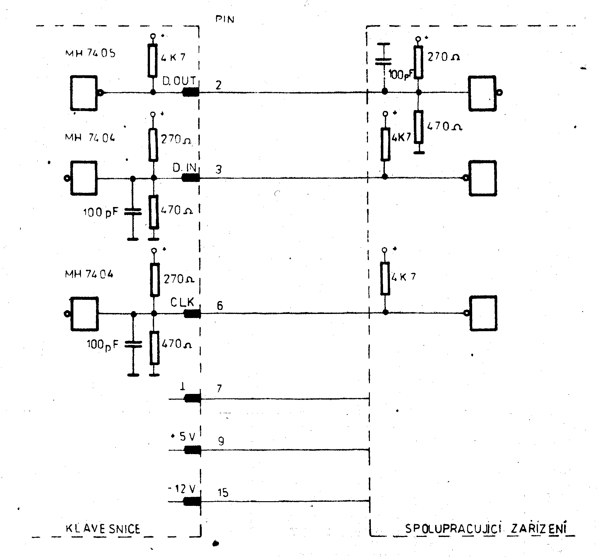 Rozložení signálů na výstupním konektoru a doporučené zapojení vstupních obvodů spolupracujícího zařízení klávesnice CONSUL 262.5