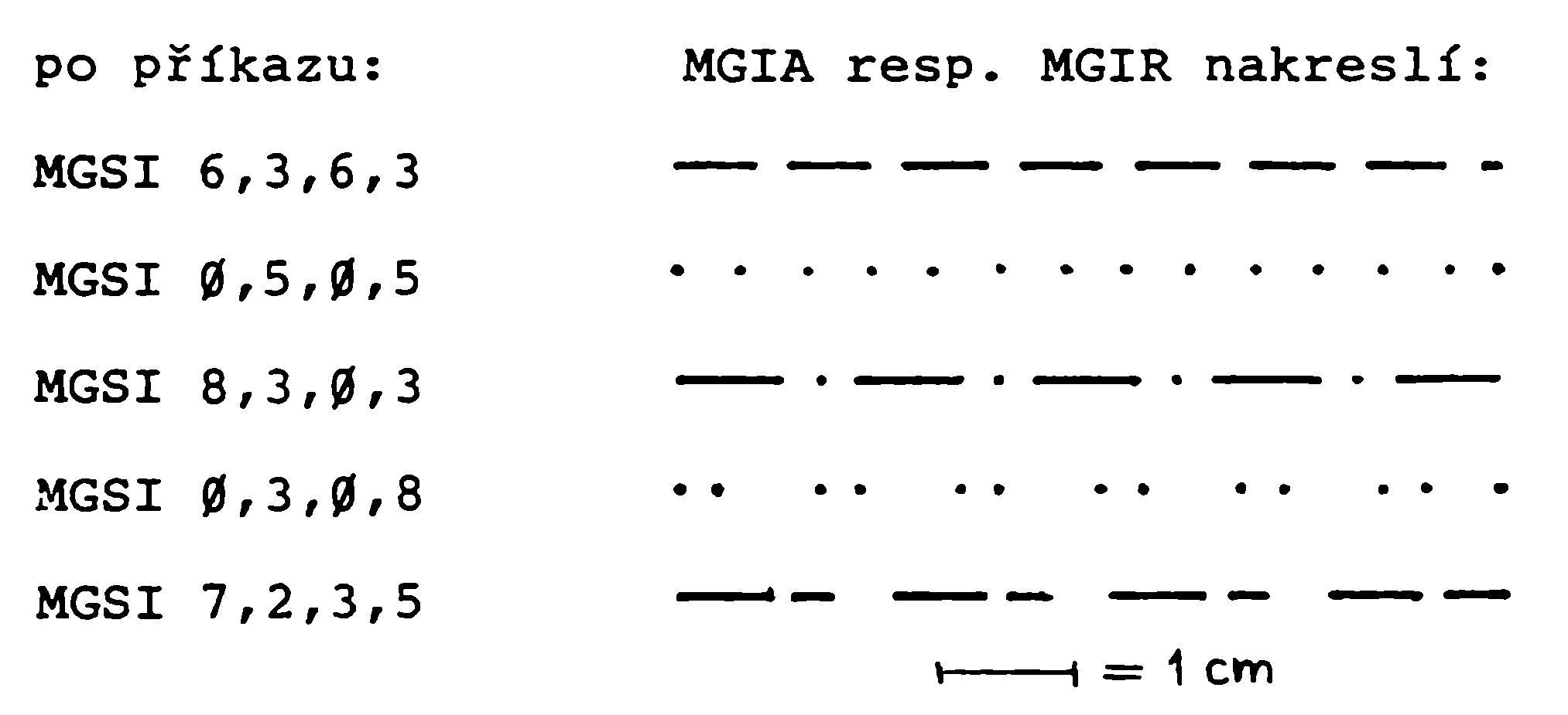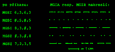 Příkaz "MGIA xa,ya" nakreslí přerušovanou úsečku (velikost čárek a mezer určuje přikaž MGSI - viz dále) z dosavadní polohy do bodu xa,ya. Pisátko zůstane spuštěno.