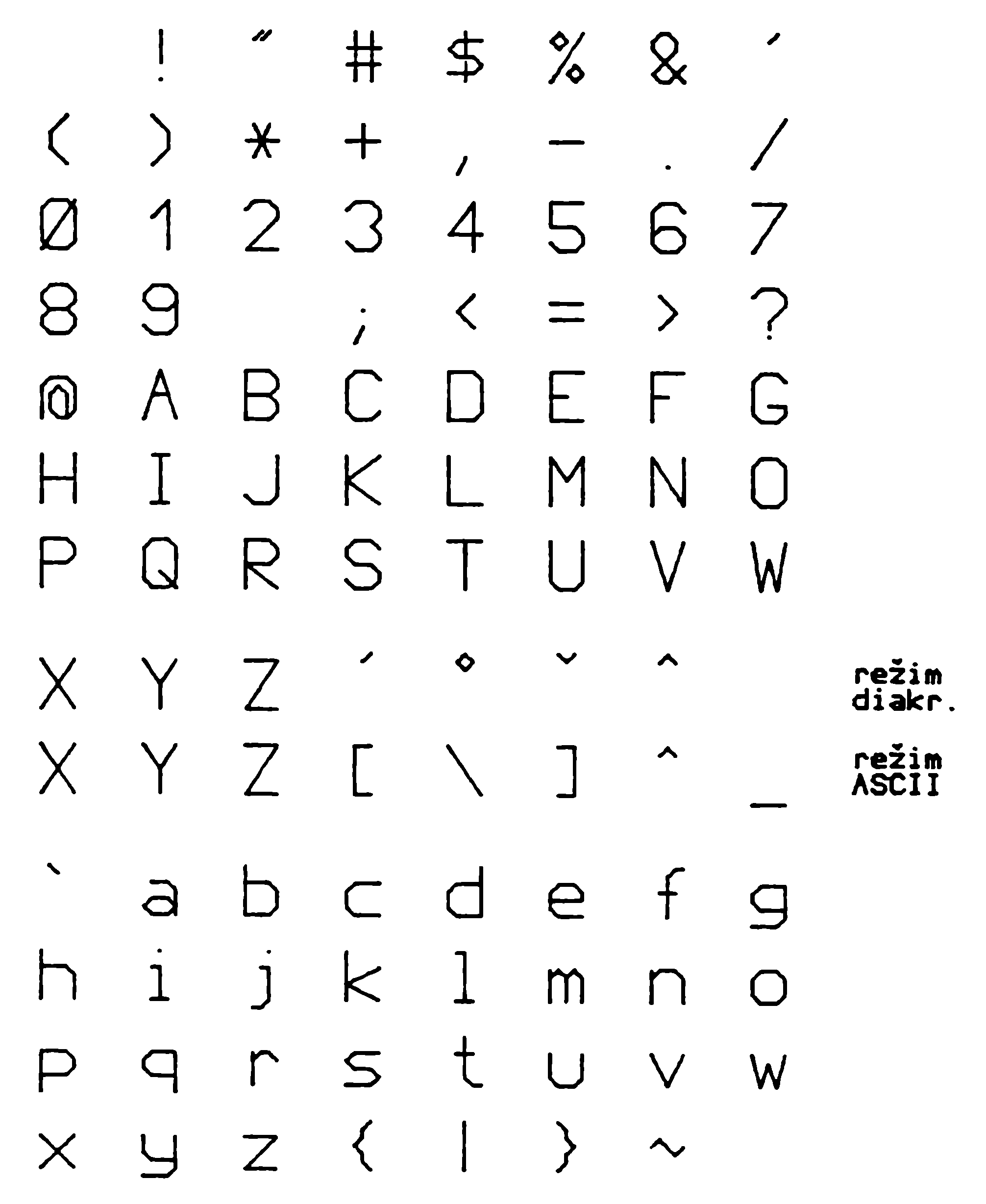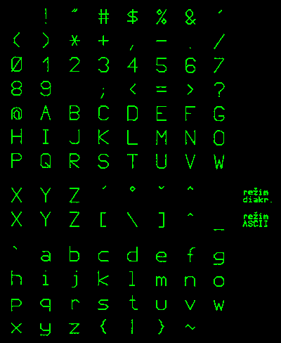 Uživatel může programem volit 2 režimy: "ASCII-režim" -tj. kompletní sada znaků ASCII, nebo "diakritický režim" - tj. sada ASCII, ale s jinou interpretaci 5 znaků [,\,],^,_ (5B až 5F hex.) podle tab.2. Režim je určen obsahem adresy 29713 (dekadicky) tak, že 0 znamená "diakritický režim" a 1 "ASCII-režim". "Diakritický režim"lze tedy volit příkazem "POKE 29713,0' a "ASCII-režim" příkazem "POKE 29713,1".