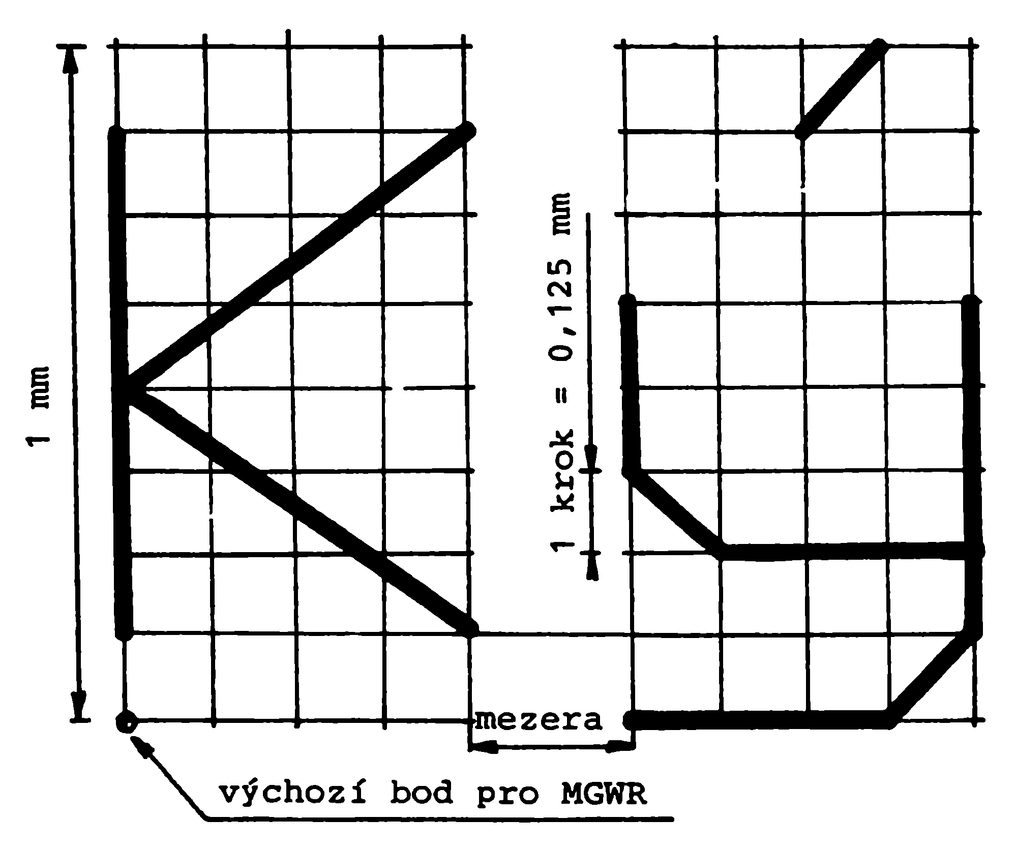 Při psaní takového řetězce příkazem MGWR bude pak nakreslen požadovaný znak - vytvořený postupným spojováním vrcholů odpovídajících číslům 0,a1,a2,...,an (s pisátkem dole či nahoře podle tab.3.). Poslední člen řetězce – CHR$(63) - zajistí zvednutí pisátka a návaznost pro psaní ev. dalších znaků. Např. pro znak "±" může být řetězec deklarován takto: