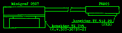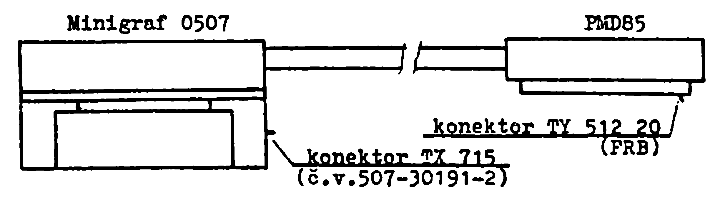 Připojení se provede plochým 9 vodičovým kabelem s konektorem pro Minigraf 0507 (který je součástí dodávký Minigrafu) a konektorem TY 512 (FRB) který se zasouvá do počítače PMD85 do pozice K3 - GPIO/0 tj. PORT A. Zapojení konektoru je uvedeno v Příloze 1.
