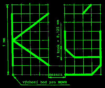 Příkaz "MGGP g" není výkonný (podobně jako MGSZ), pouze nastaví šířku mezery mezi znaky řetězce kresleného příkazem MGWR (viz dále) na "g" kroků pro základní tvar znaku (viz obr. 2.) tj. g krát xx/8 mm pro výsledný tvar znaku. Parametr "g" smí nabývat hodnot 1 až 11. Příkazy MGOG a MGLS nastavují standardní mezeru g=2.