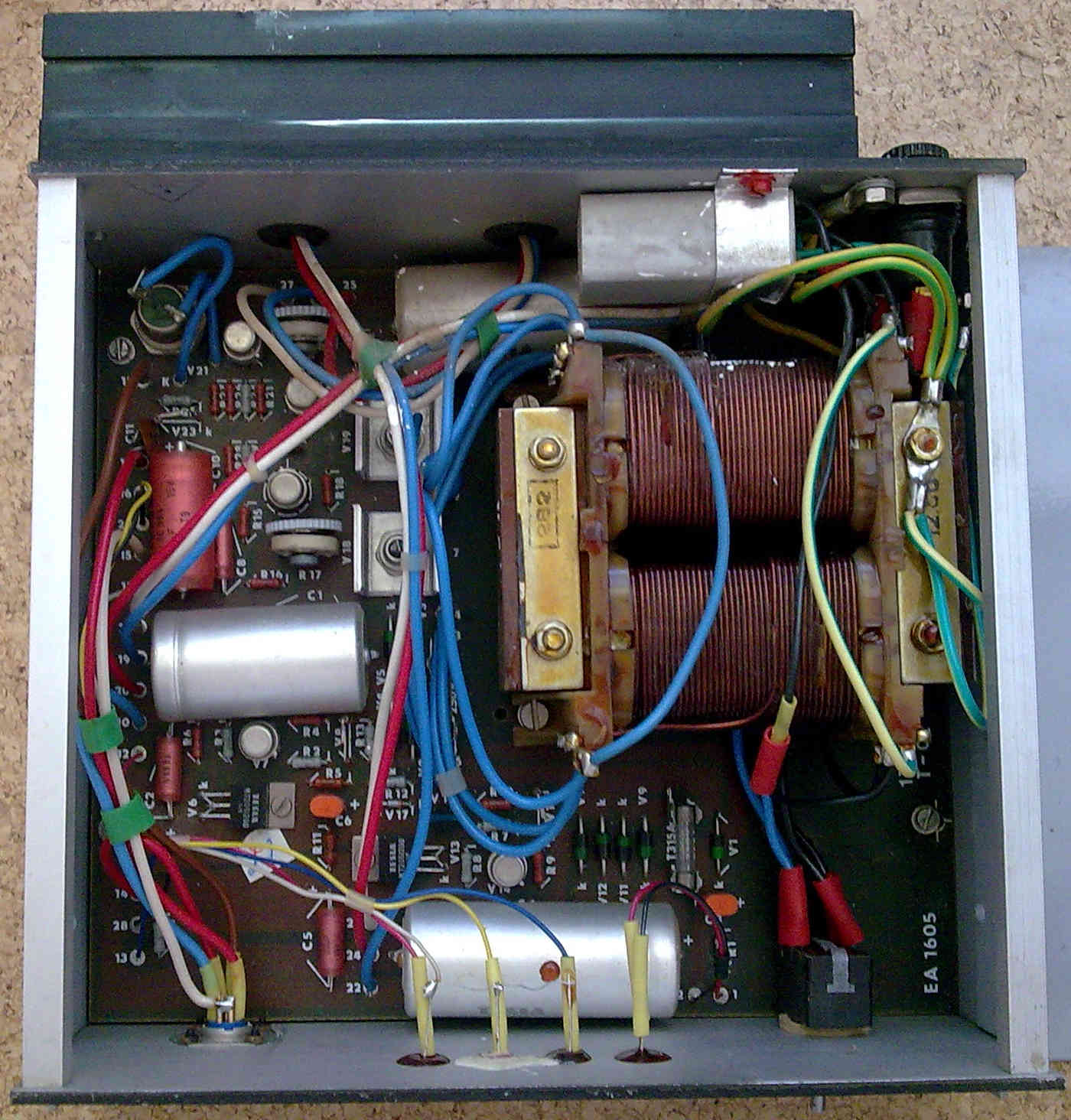 Zdroj EA 1605 je určen k napájení mikropočítačů založených na mikroprocesoru 8080A. Jedná se precizní lineární zdroj s hlídáním pořadí náběhu napětí, přepěťovými a proudovými pojistkami. Nepovedlo se mi nikde dohledat jaký výkon je zdroj schopný dodat ale vzhledem k tomu že nestačil na napájení PMD 85-2A a PMD 85-3 lze odvodit aspoň přibližné hodnoty: