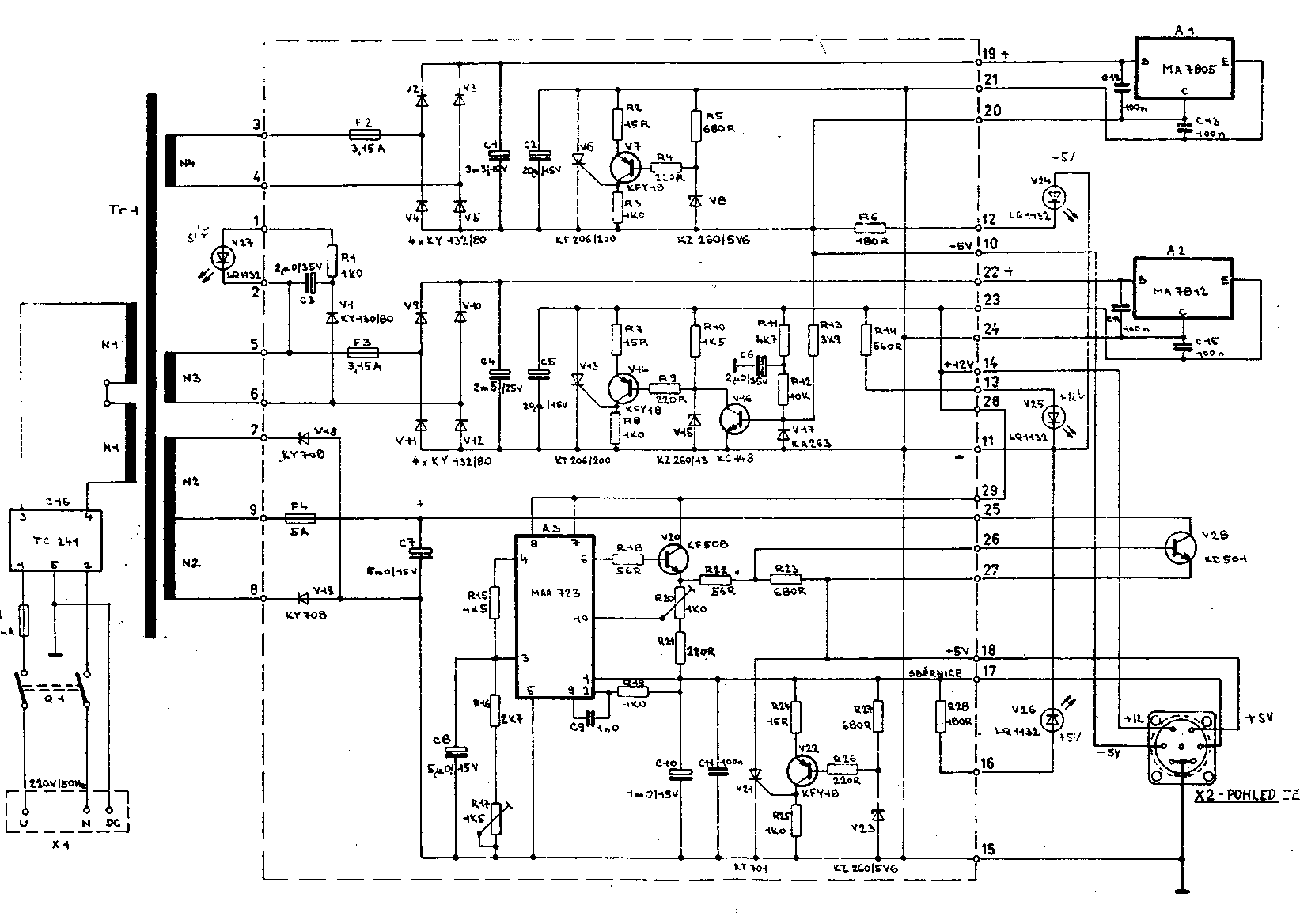 Ve zdroji jsou tři pojistky ale na první pohled jsou vidět jen dvě, ta třetí se schovává mezi transformátorem a zadním panelem.