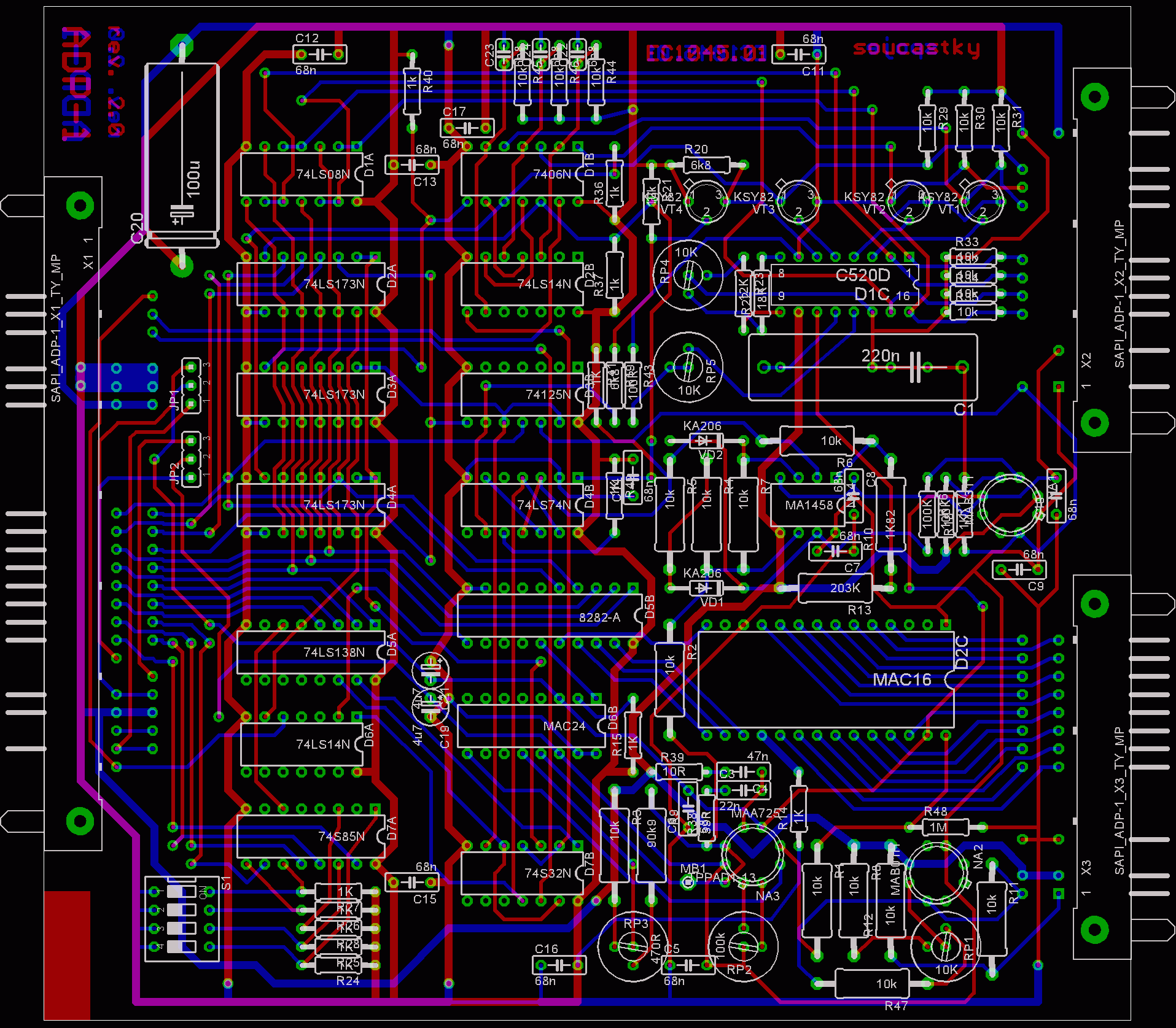 Výstupy BCD hodnot QA až QD obvodu C 520D mají otevřený kolektor a proto jsou na desce ADP-1 připojeny ke kolektorovým odporům R32 až R35. Dále jsou tyto signály vedeny přes obvod D1A na vstupy registrů D2A, D3A a D4A. Výstupy registrů vedou na konektor X1, kterým je deska připojena ke sběrnici systému SAPI-1.
