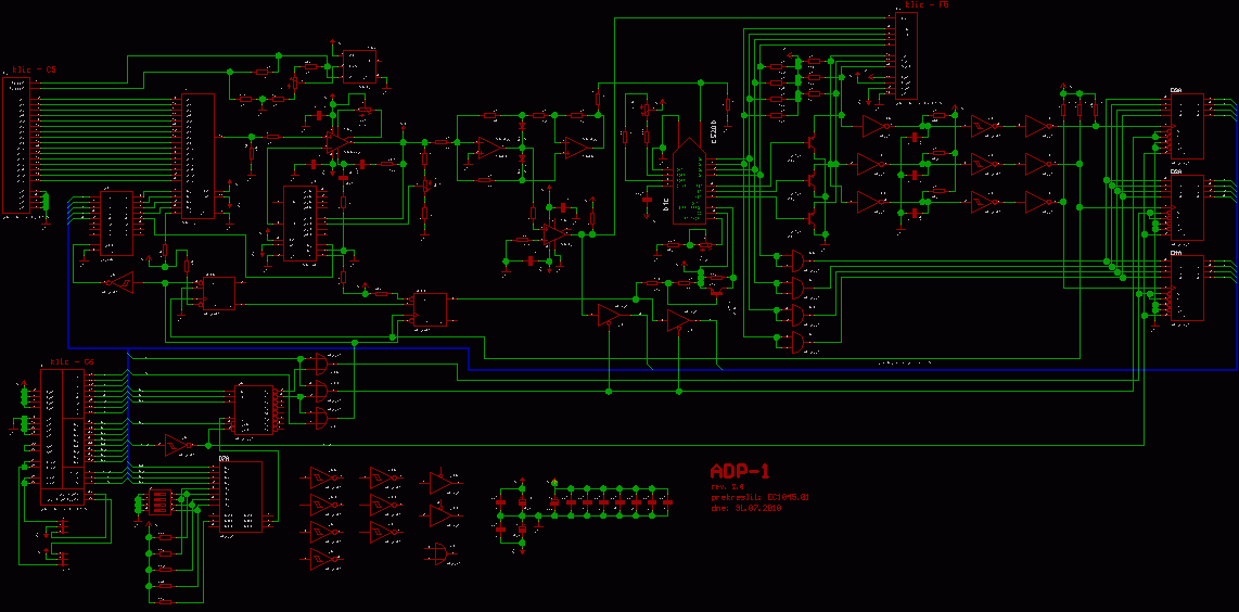A/D převodník C 520 D (D1C) je určen především pro činnost v režimu přímého zobrazování. Tři výstupní byty po čtyřech bitech jsou přiváděny na výstupný čtyřbitovou sběrnici časově multiplexované. Přítomnost dolního, středního a horního bytu na výstupní sběrnici je určována trojicí signálů MPX, na nichž se objevují mimo užitečného signálu i rušivé impulsy, které sice nevadí při přímém zobrazováni, avšak znemožňuji zápis do rychlých registrů. Z toho důvodu jsou na desce ADP-1 signály MPX vedeny od obvodu D1C přes transistory VT1 až VT3 zajišťující přizpůsobení těchto signálů úrovním TTL a dále přes invertory D1B a RC členy R44 C22, R45 C23, R46 C24 a tvarovače D2B. Časová konstanta RC členů oddělených hradly D1B a D2B je 10µs a to postačuje k potlačení rušivých signálů, trvajících přibližně 1µs.