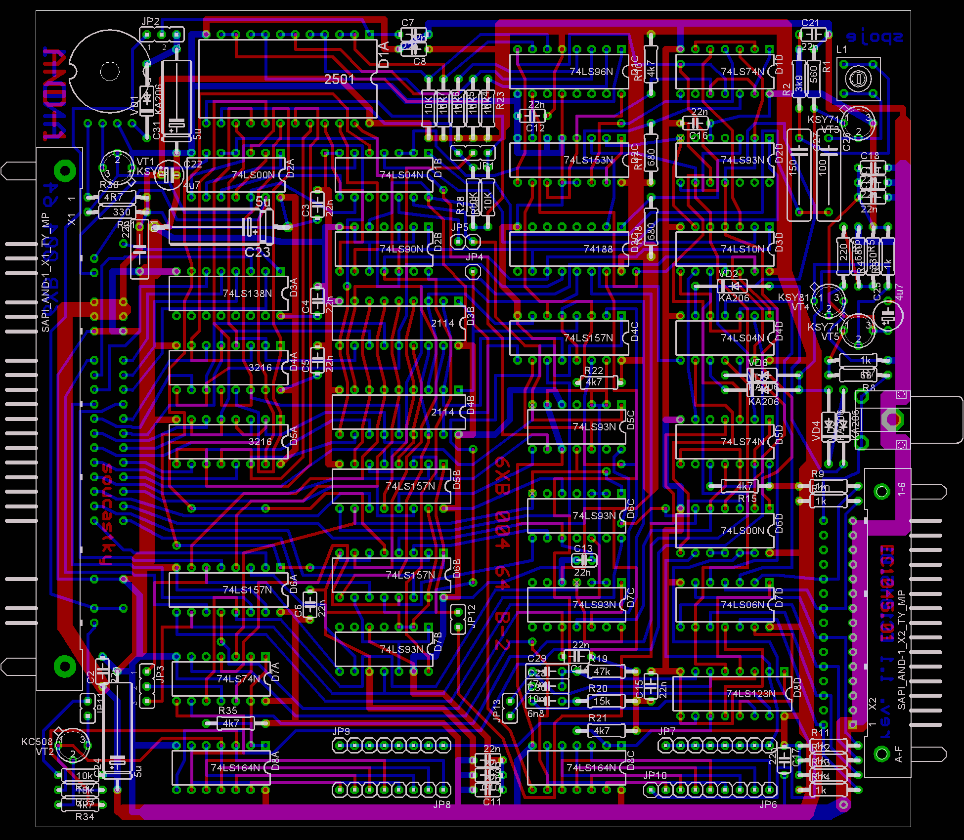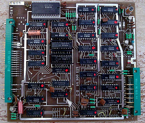 Deska alfanumerického displeje AND-1. Na desce AND-1 jsou obvody, umožňující zobrazit 40 znaků na 24 řádcích TV přijímače nebo videomonitoru. Deska tak tvoří ve spojení se zobrazovací jednotkou displej pro mikropočítačový soubor SAPI-1. Procesor komunikuje s displejem jako s pamětí, s kapacitou 2K byte, která leží v rozsahu adres 3800 až 3DE7. Pro komunikaci používá procesor signály MR a MW, to znamená, že může z paměti číst i do ní zapisovat. Je proto možné zajistit za pomoci programu rolování řádek a jiné operace. Takto organizované paměti displeje říkáme VIDEORAM. Možnost přístupu do paměti ze sběrnice i z vnitřních obvodů displeje zajišťuje multiplexer adresy, tvořený obvody D5B, D6B a D6A. Přepnutí adresy zajišťuje signál SEL /vývod 1 obvodu D5B - 1/D5B/, který je generován dekodérem adresy D3A. V okamžiku výběru desky jsou od paměti RAM odpojeny čítače a jsou připojeny adresové linky sběrnice A 0 až A 10. Toto přepnutí trvá prakticky jen jeden strojový cyklus mikroprocesoru a na tuto dobu je provedeno zatemění stínítka /4/D5D/. Není-li únosné mít na stínítku černé čárky, vzniklé zápisem "za chodu", je možno signálu /INT 1 a za pomoci přerušení manipulovat s obsahem VIDEORAM jen při zpětném běhu snímku. Na přenos dat je pak asi 5 až 7 ms podle počtu zobrazovaných řádků 24 nebo 20.