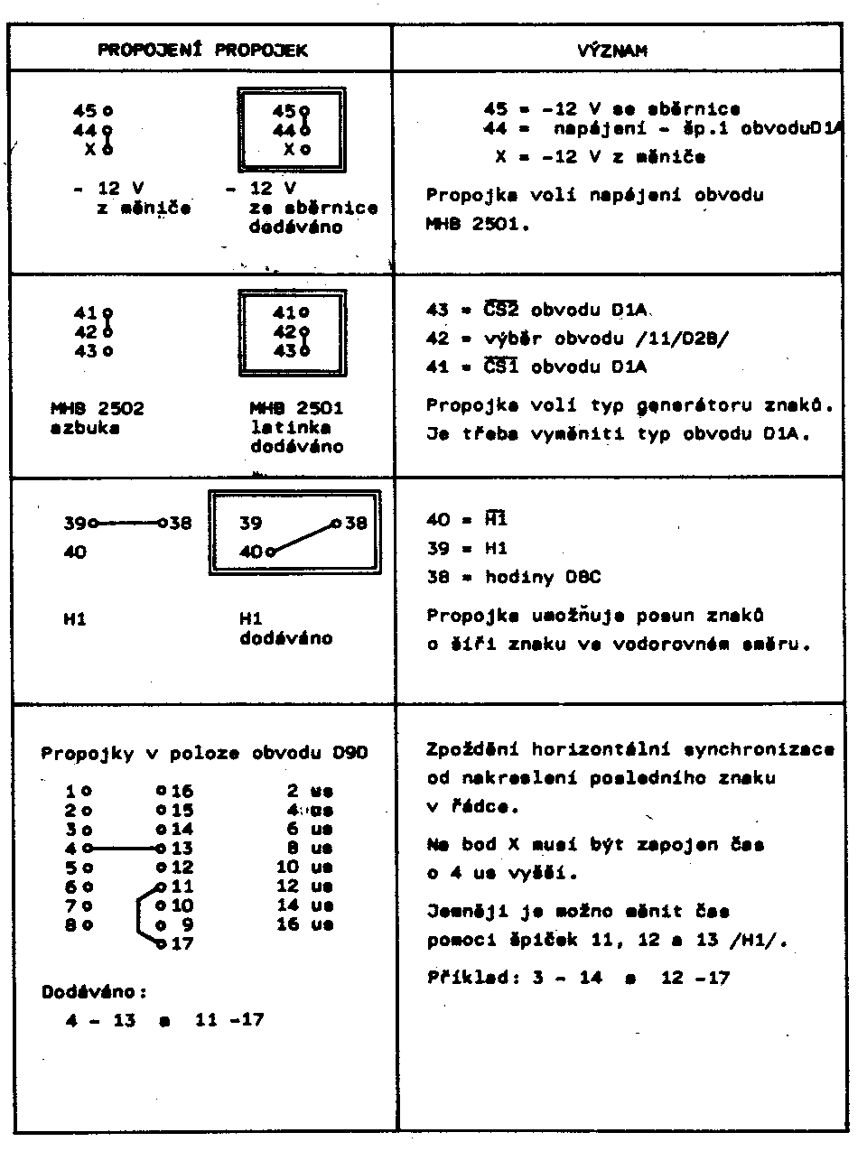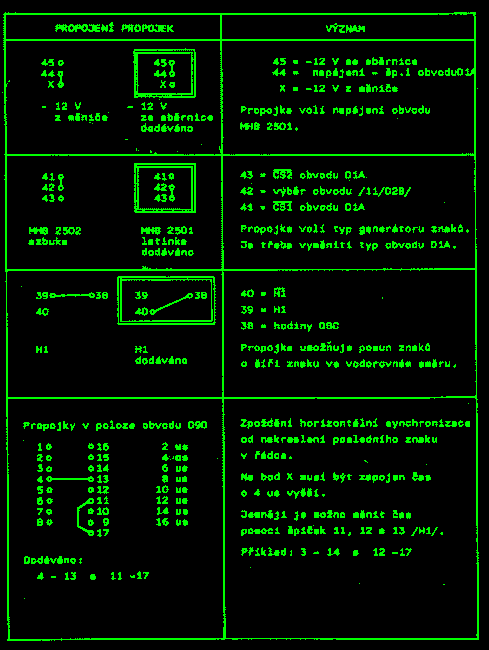 Generátor znaků D1A je zasunut do objímky a je ho možné vyměnit za obvod MHB 2502, který "umí" azbuku. V tom případě je nutné přepojit spojku 9-8 na 9-10.Výstupy generátoru znaků vedou na vstupy posuvného registru D1C a jsou "přitaženy" odpory na + 5V, protože se pro vytvoření mezery mezi řádky používá zavření výstupů DlA signálem 8 L na vstupy CS 1 a CS 2. Je to vlastně trik, protože tím se řádky 8,9 a 10 rozsvítí, můžeme je ovládat zatmíváním z paměti PROM /D3C/. Tak je zajištěno svícení kursoru v deváté lince.