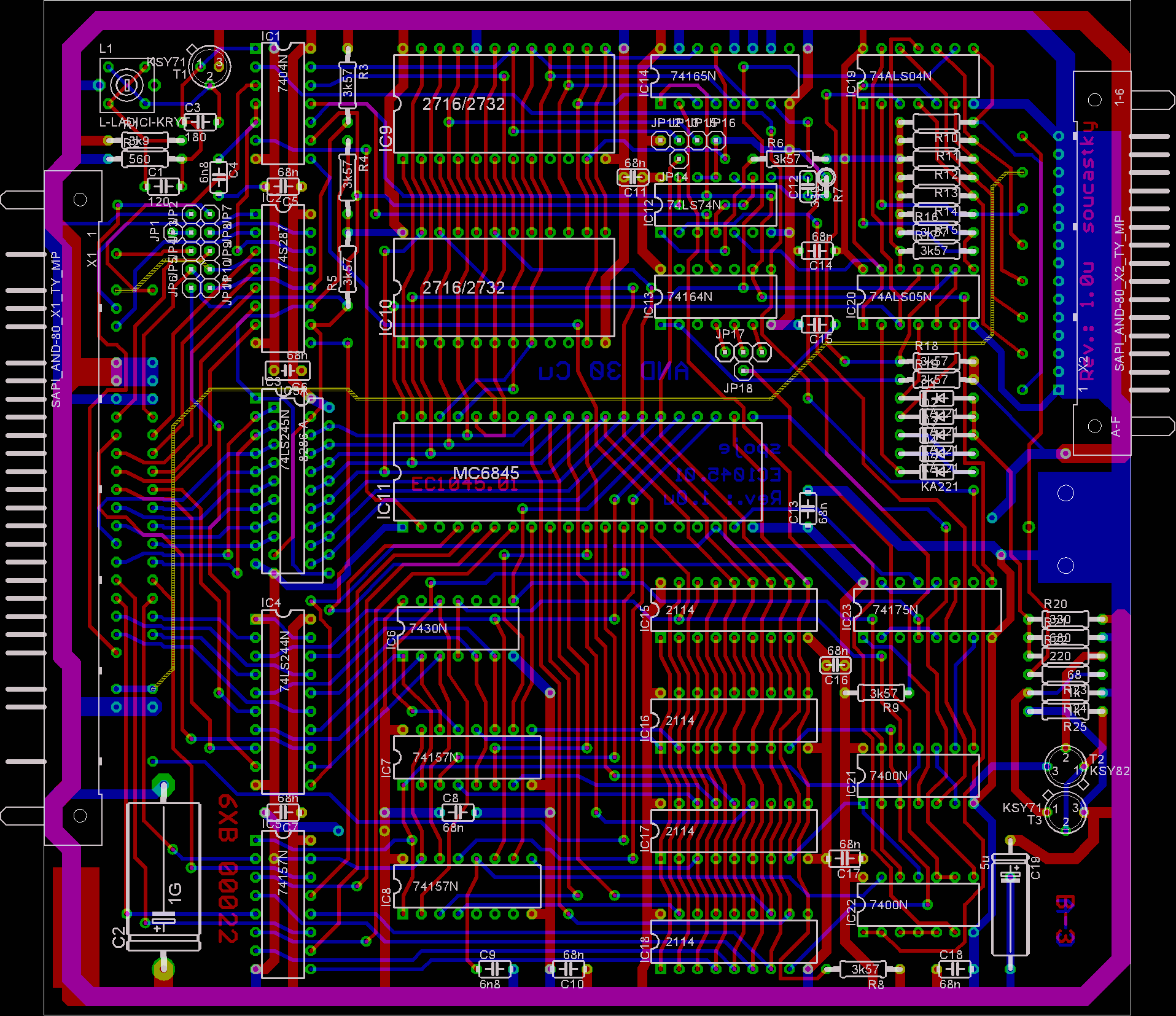 Deska alfanumerického displeje AND-30C je postavená na obvodu MC6845, vzhledem k použití bodovému kmitočtu 10.8MHz, velikosti znaku 6x12 bodu a RAM o kapacitě 2kB bylo možno dosáhnout na standardní TVP s video vstupem 80 znaku na řádek a max. 21 řádků. Font znaků je shodný s deskou videa AND-1Z. Znakový generátor je řešen pomocí EPROM a jde osadit typy 2716 nebo 2732. Pro znakový generátor při plné znakové sadě je potřeba 4kB. Při vhodném nastavení propojek a osazení 2x 2732 je možno mít dvě znakové sady, přepínání znakových sad se bude provádět pomocí některého signálu MAP nebo S. Jako u celé sestavy SAPI-IPS co nebylo potřeba, k provozu sestavy to není osazeno. Při překreslování DPS jsem zanesl většinu úprav, co byla provedena na DPS, proto je ve schématu i na DPS to „u“ v názvu.