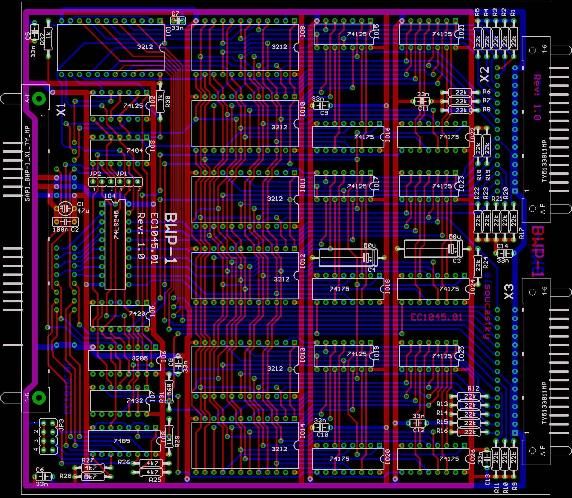 Původně bylo v plánu, že na desce budou čtyři porty, ale nakonec se vlezli jen tři. Pro potřeby testeru IO je potřeba mít k dispozici ovládací signály a pak také jsem chtěl, aby deska v systému zabírala co nejméně adres. Do volného prostoru byl proto přidán řídící registr IO1 3212. Kdy LOG0 na bitu 7 určuje že se bude provádět zápis do výstupních registrů (3212) a LOG1 určuje že se bude provádět zápis do pomocných registrů (2x 74175). LOG0 na bitu 6 provede reset desky, aneb uvede desku do výchozího stavu, tj. všechny obousměrné porty jsou jako vstupní, pro povolení výstupů je třeba, aby na bitu 6 řídicího registru IO1 3212 byla LOG1. Vzhledem k tomu že řídicí registr IO1 3212 je připojen na systémový reset tak se výchozím stavu nachází deska po reset systému, ale jde desku uvést do výchozího stavu i programově. Zápisem do pomocného registru (2x 74175) se určuje, které bity budou výstupní, aneb na kterém bitu pomocného registru (2x 74175) bude LOG1 tak ten bit bude výstupní. Adresa pomocného registru (2x 74175) je shodná s adresou výstupního registru (3212) to kam se bude, provát zápis určuje bit 7 řídicího registru IO1 3212.