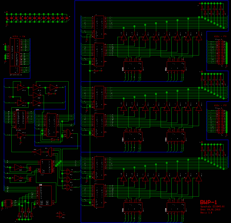 Původně bylo v plánu použít budiče a registry v pouzdrech DIL 20 ale nakonec jsem použil 3212 a to z toho důvodu že má dva povolovací vstupy a reset, což zjednodušilo výběrové obvody. Jak jsem zjistil tak 3212 je zajímavý multifunkční střadač/budič jen jeho použití komplikuje jeho široké pouzdro DIL 24. Ale v daném zapojení by se moc místa neušetřilo použitím budičů a registrů v úzkých pouzdrech DIL 20 a ještě by bylo potřeba jedno IO na víc.