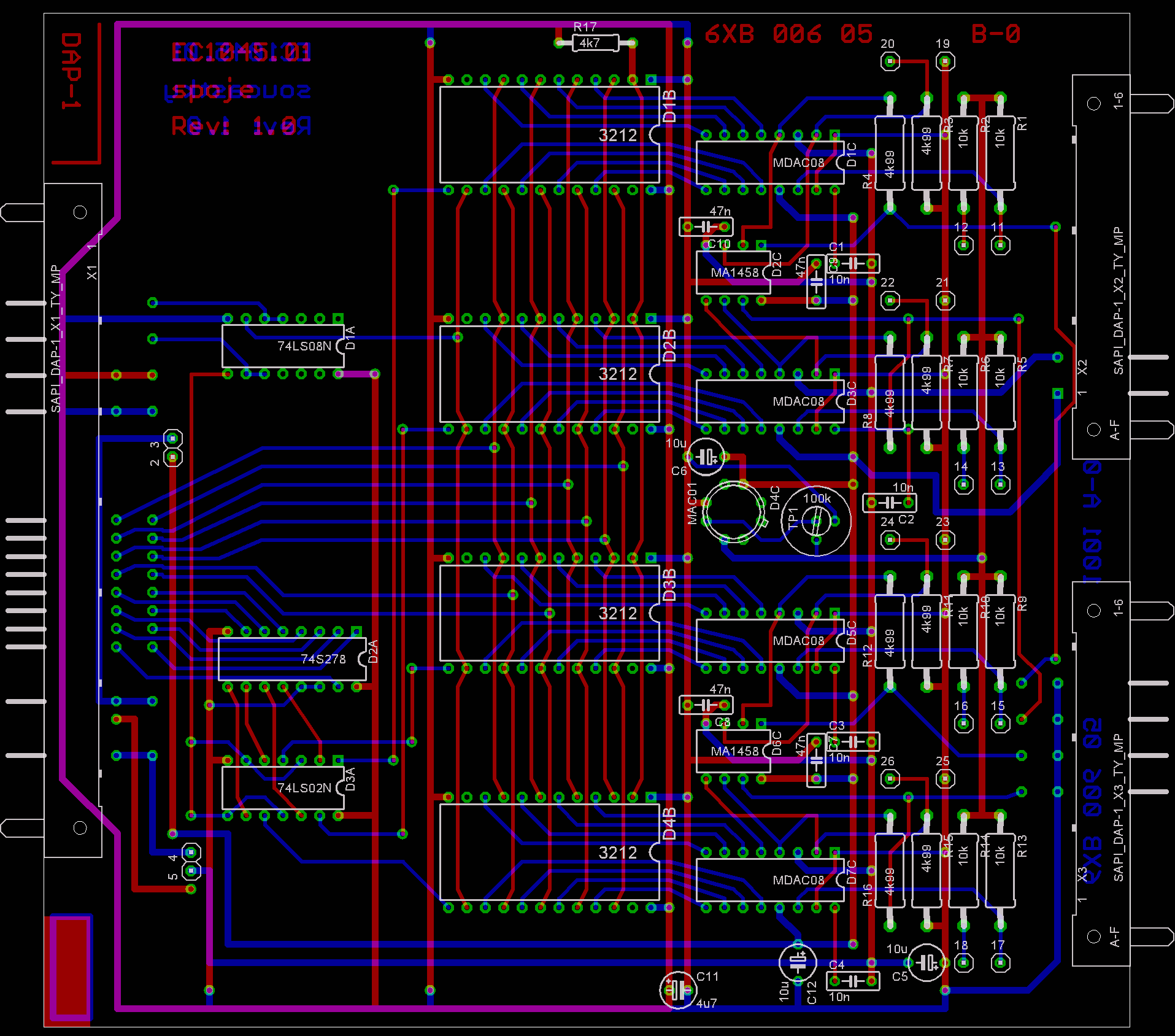 D/A převodníky MDAC08 (D1B, D2B, D3B.D4B) jsou zapojeny podle základního katalogového schéma a mohou pracovat ve dvou režimech činnosti buď jako bipolární (-5V až +5V) a nebo unipolární (0 až +5V). Požadovaný režim, se volí propojkami 19-20, 21-22, 23-24. a 25-26. Při spodní propojky je vyřazen odpor na výstupu proudu Io z převodníku a na vytváření výstupního napětí z operačního zesilovače se zúčastní pouze proud Io, který nemůže měnit směr a proto je výstup pouze jedné polarity. Při rozpojení propojky se zúčastni na vytváření výstupního napití oba proudy (lo i Io), které mají opačný směr a výstup může nabývat obou polarit napětí.