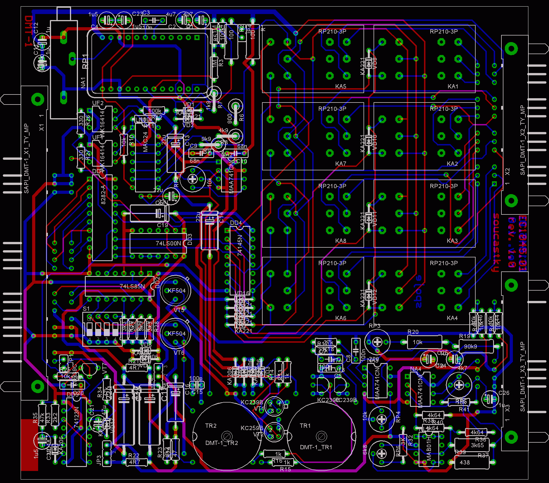 Na desce DMT-1 byl jiný zesilovač, který byl následně nahrazen WSH222 a to tak, že původní zapojení zůstalo. Na replice je pouze varianta pro WSH222 čímž došlo k úpravě a zjednodušení DPS. Jak říká můj známý, byl to porod sasanek(nebo ježka proti srsti) ;-).