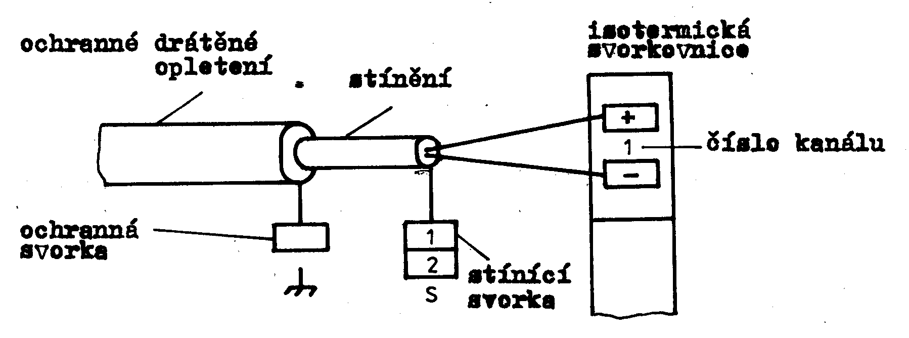 K těmto svorkám se připojuje vnější drátěné opletení kompenzačního vedení. Má-li použitý termočlánek dvojitou izolaci a je-li bezpečně oddělen od sítě, podle ČSN 18 0003 čl. 15, nemusí být ochranná svorka zapojena. Příklad zapojení jednotlivého kanálu viz obr. 1