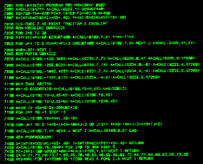 1 REM UKAZKOVY PROGRAM PRO MINIGRAF 0507 3 A=CALL(6171):A=CALL(6222,1):GOSUB 440 5 XS=750:YS=-670:PI=3.14159:FI=-PI/6:R=450 7 X=INT(R*COS(MI)+XS+.49):Y=INT(R*SIN(MI)+YS+.49) 10 CLS:CURS 7,15:PRINT "POCITAM A KRESLIM" 20 REM KRESLENI OBRAZCE 30 FOR I=0 TO 30 40 MI=FI+I*PI/60:GOSUB 400:A=CALL(6189,Y,X):X1=X:Y1=Y 50 FOR J=1 TO 5:MI=MI+PI/3:GOSUB 400:A=CALL(6195,Y,X):NEXT J:A=CALL(6195,Y1,X1) 60 R=R*.971:NEXT I 65 REM POPIS OBRAZCE 70 A=CALL(6189,-429,360):A=CALL(6231,7,7):A=CALL(6234,0,4):A=CALL(6225,8,17280) 80 A=CALL(6189,-255,836):A=CALL(6231,7,14):A=CALL(6234,0,-8):A=CALL(6225,4,17288) 90 A=CALL(6189,-1042,462):A=CALL(6231,7,7):A=CALL(6234,4,-4):A=CALL(6225,6,17292) 100 A=CALL(6189,-1177,811):A=CALL(6234,-4,4):A=CALL(6225,5,17298) 110 REM ZNAK ARITMA 120 R=112:GOSUB 420:A=CALL(6189,YS+R,XS):U=R/SQR(2) 130 A=CALL(6195,YS-U,XS-U):A=CALL(6195,YS,XS) 135 A=CALL(6195,YS-U,XS+U):A=CALL(6195,YS+R,XS) 140 R=29.22:YS=YS-54:GOSUB 420 150 FOR I=1 TO -1 STEP -2 160 A=CALL(6189,YS+14*I,XS-19) 170 FOR J=1 TO 5:Y=YS+I*(4-10*(J<2 OR J>3)):X=XS-19*(J<3)+19*(J>2) 180 A=CALL(6195,Y,X):NEXT J:NEXT I:A=CALL(6189,0,0):END 390 REM PODPROGRAMY 400 X=INT(R*COS(MI)+XS+.49):Y=INT(R*SIN(MI)+YS+.49):RETURN 420 A=CALL(6189,YS,XS+R):FOR I=0 TO 360 STEP 5 430 MI=I*PI/180:GOSUB 400:A=CALL(6195,Y,X):NEXT I:RETURN 440 DATA 77,73,78,73,71,82,65,70,48,53,48,55,65,82,73,84,77,65,80,82,65,72,65 450 RESTORE:FOR I=17280 TO 17308:READ A:POKE I,A:NEXT I:RETURN