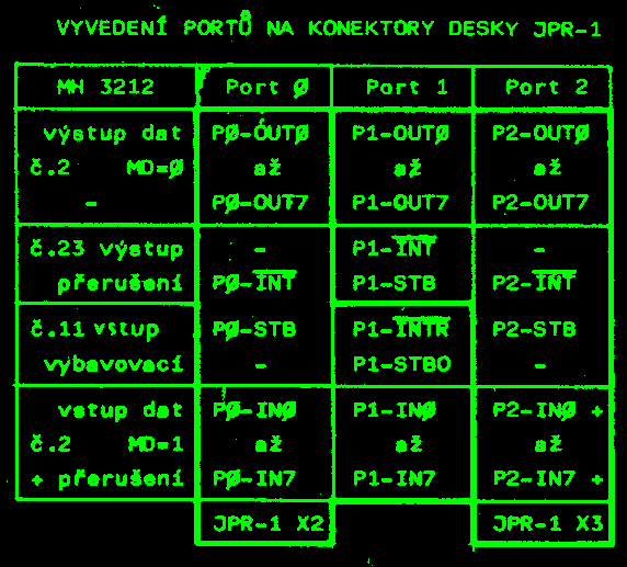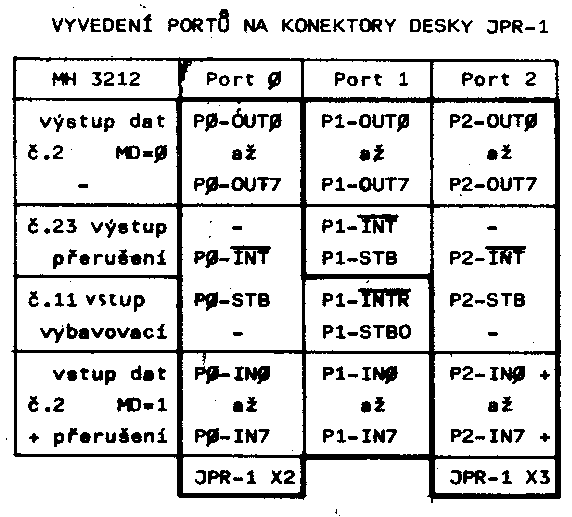 Kromě pamětí jsou na desce i vstupní a výstupní porty a přerušovací systém, mající 8 vstupů a 8 úrovní přerušení. Vstupy a výstupy jsou vyvedeny na konektory X2 a X3. Porty jsou tvořeny obvody MH 3212, takže mají úrovně TTL a jsou odolné proti zničení. Na konektoru X2 jsou vyvedeny vstupy portu P0 / 8 vstupů/ a signál STB /vzorek/ portu P0. Dále výstupy portu P0 / .8 výstupů/ a signál INT /přerušení/ portů P0. Dále vstupy por tu P1 /8 vstupů/ a výstup INT portu P1 a vstup STS portu P0.