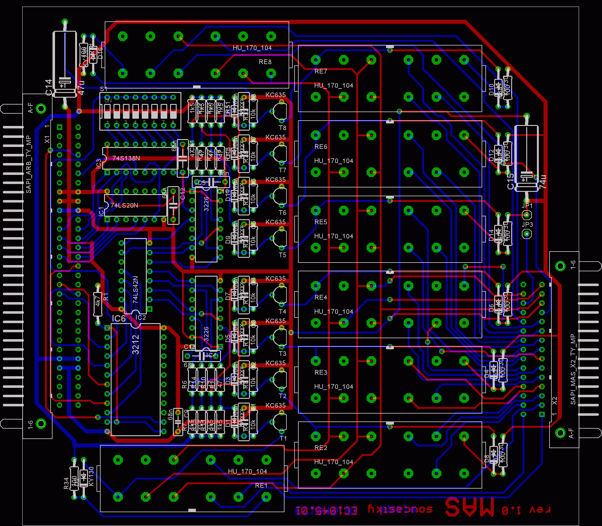 Deska obsahuje 8x 3 pólové relé s vyberem 1 z 8 a společnou sběrnicí