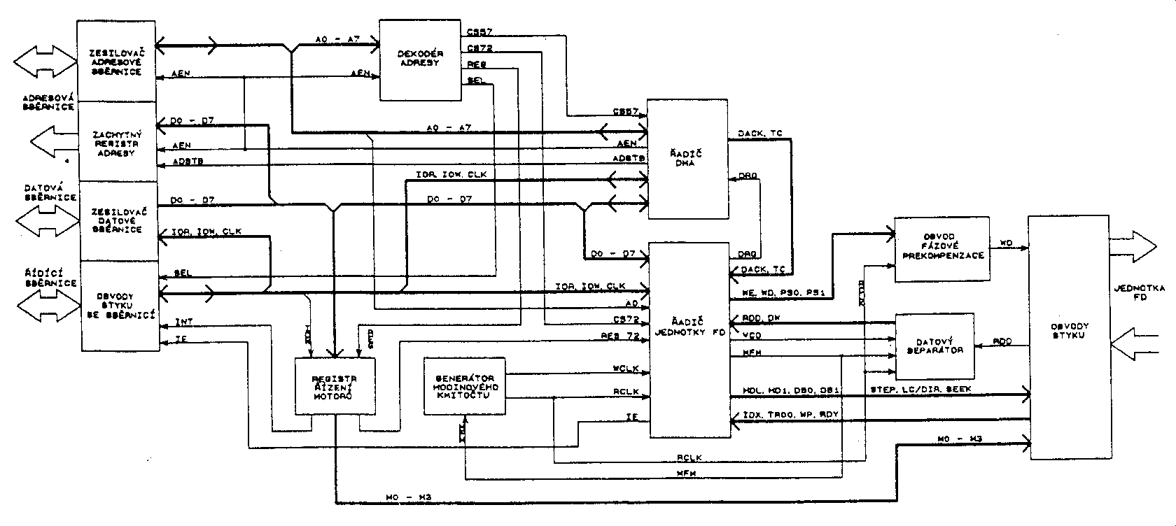 Jednotky floppy disků se připojují k výstupu řadiče paralelně. Výstupní signály řadiče jsou v jednotkách zakončeny odpory hodnoty řádu stovek ohmů připojenými na +5 V. Aby bylo možno.současně ovládat čtyři mechaniky, jsou výstupní signály zesíleny tranzistory VT2 až VT8. Vstupní signály jsou na řadiči zakončeny odpory R22 až R26 a tvarovány obvodem DD17.