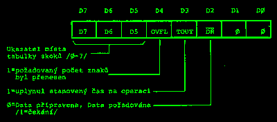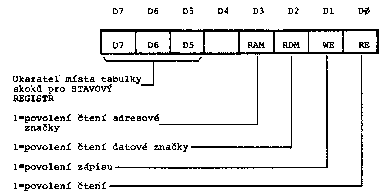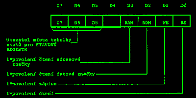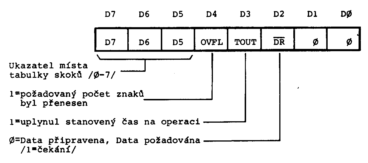 Stavový registr je navržen tak, aby umožnil snadné odskoky pomocí instrukce PCHL. Pro potřebné odskoky v programu stačí naplnit registr H počítače konstantou, přečíst obsah stavového registru, vložit jej do registru L počítače a instrukcí PCHL odskočit na příslušnou adresu, kde může být uložena např. instrukce JMP nebo CALL. Pro zjednodušení lze bity D7, D6 a D5 stavového registru nastavit řídícím registrem, bity D4, D3 a D2 přenášejí stavovou informaci a bity D1 a D0 musí být rovny nule /vytvoření prostoru pro JMP nebo CALL/. Nastavením bitů D7, D6 až D5 lze volit např. tabulku skoků pro čtení a tabulku pro zápis.