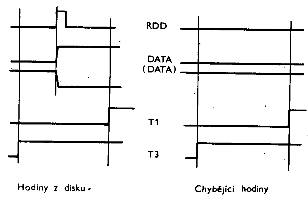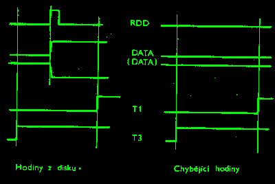 Vyhodnocení informace přicházející z disku pak vychází z impulsů T1 a T3. Separátor porovnává stav výstupu D3D/9 v okamžiku náběhu T1 se stavem tohoto výstupu v předchozím náběhu T3. Pokud jsou tyto stavy rozdílné, musel přijít hodinový impuls, který způsobil změnu signálu DATA. Vyhodnocení hodin je prováděno obvodem D2B/11, D2C/9, D2C/5. Princip vyhodnocení hodin je na obr.5. Vyhodnocení dat je prováděno obdobně, avšak je zaměněna funkce časů T1 a T3 /obvod D1C/9, D2B/3, D2B/1, D1B/5/.
