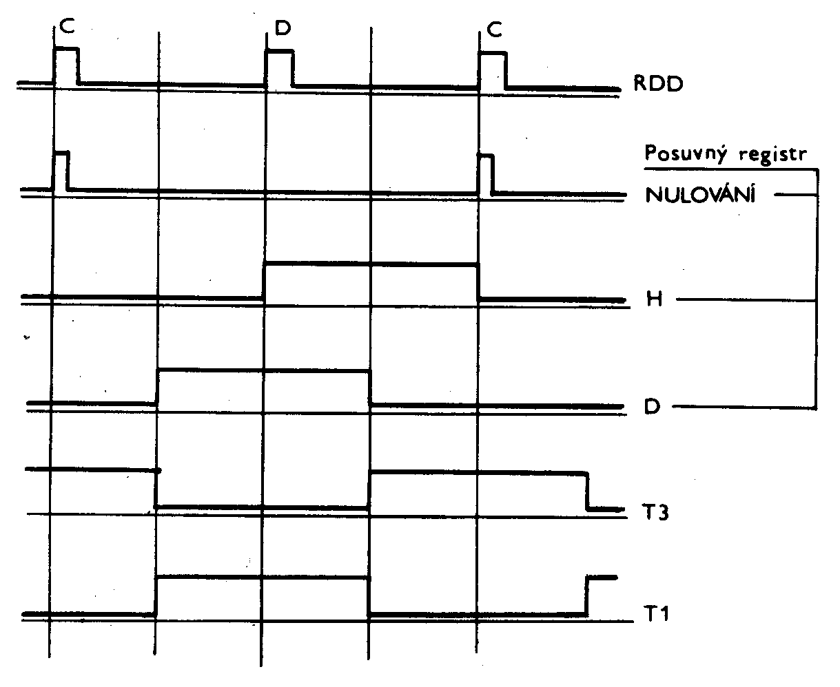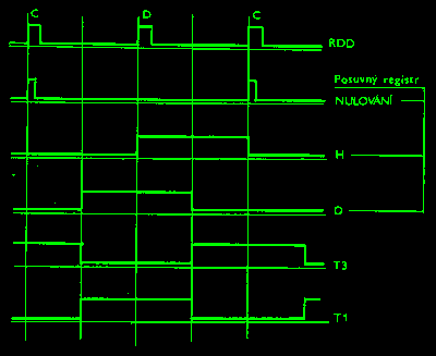 Sériový signál přicházející z diskové jednotky překlápí klopný obvod D3D/9 zapojený jako dělič dvěmi. Zároveň tento signál zaznamenává do obvodu D3D/5 informaci přivedenou na vstup D tohoto obvodu. Pokud má tato informace hodnotu H dojde opět k nulování tohoto obvodu a tím ke vzniku krátkého impulsu, jímž je nulován posuvný registr D2A. Tento registr je trvale posouván referenčním kmitočtem /4MHz pro 8" disk a 2MHz pro 5,25" disk/. Na výstup registru D2A je připojen tvarovač, na jehož výstupu vzniká tzv. čas T3 a jeho inverze tzv. čas T1. Při správné synchronizaci separátoru je posuvný registr D2A nulován pouze hodinovými impulsy z disku /obr.5/.