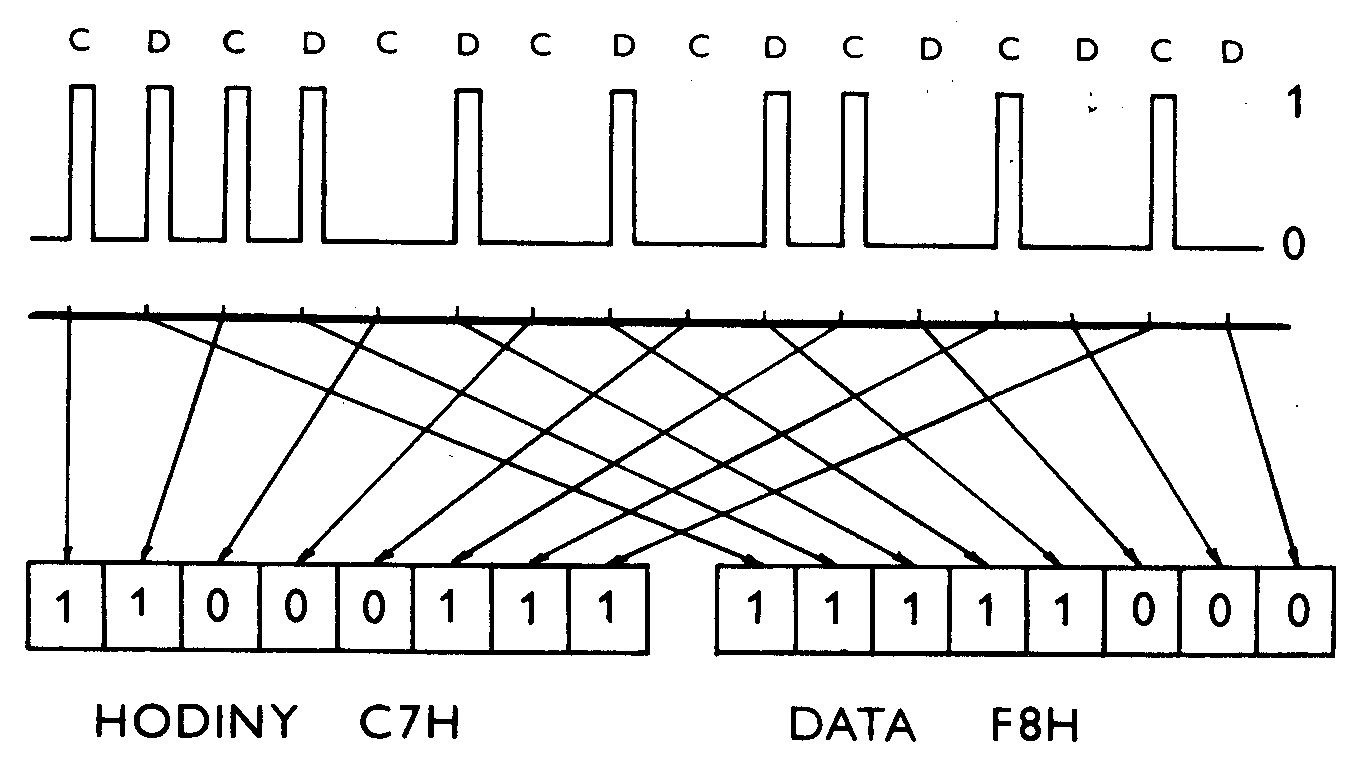 Z jednotky pružného disku je datový a hodinový signál předáván po společním vodiči /obr.3/. Z důvodu rozlišení dat od řídících znaků trvale zapsaných na disk /začátek adresové části, začátek datové části, Index/ jsou řídící znaky označeny vynecháním některých hodinových impulsů /tab.2/. Separátor dat a hodin slouží k rozdělení informací přicházejících z diskové jednotky na informace nesené daty a informace nesené hodinami.