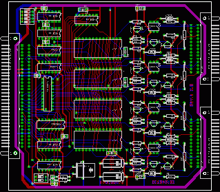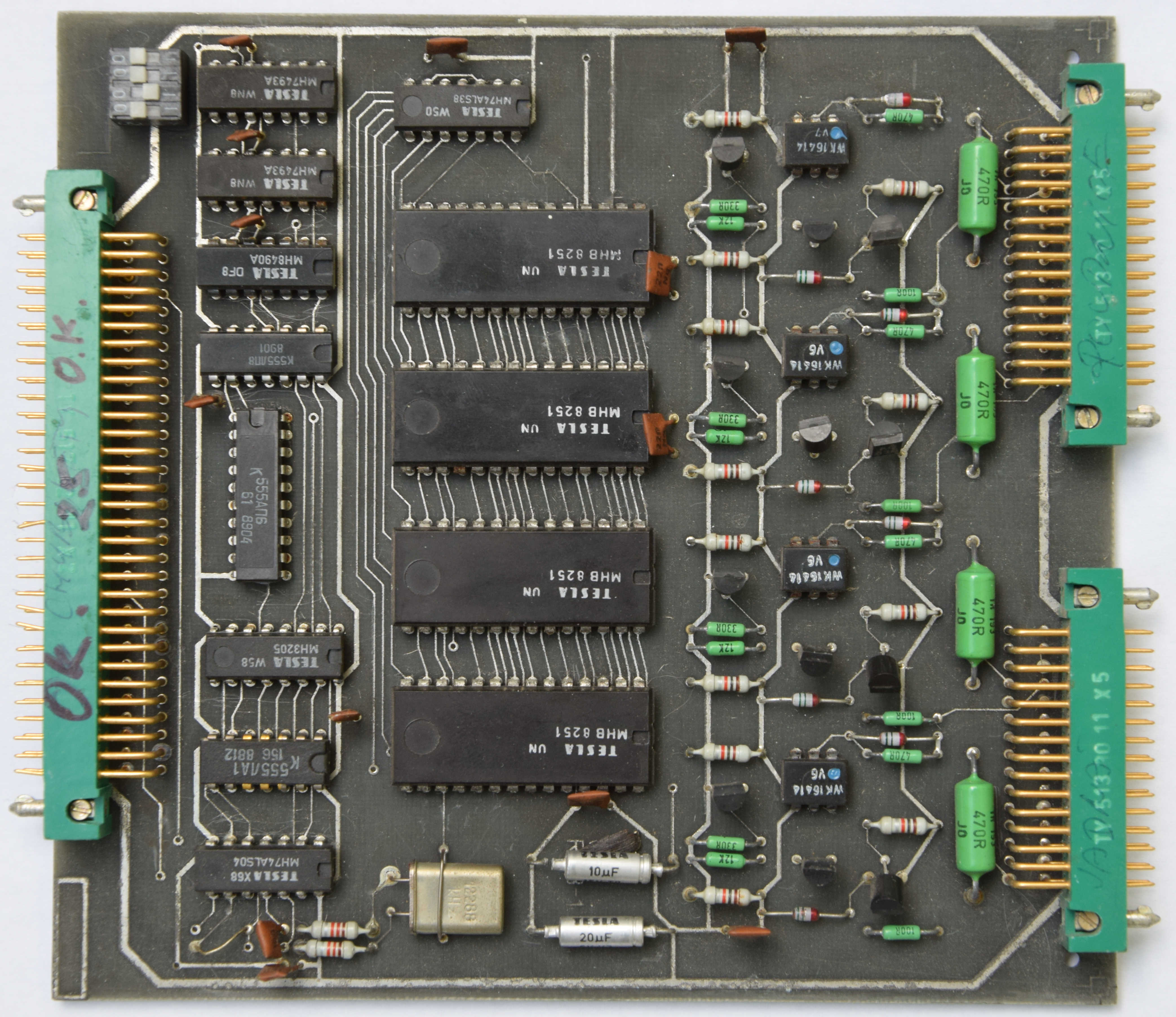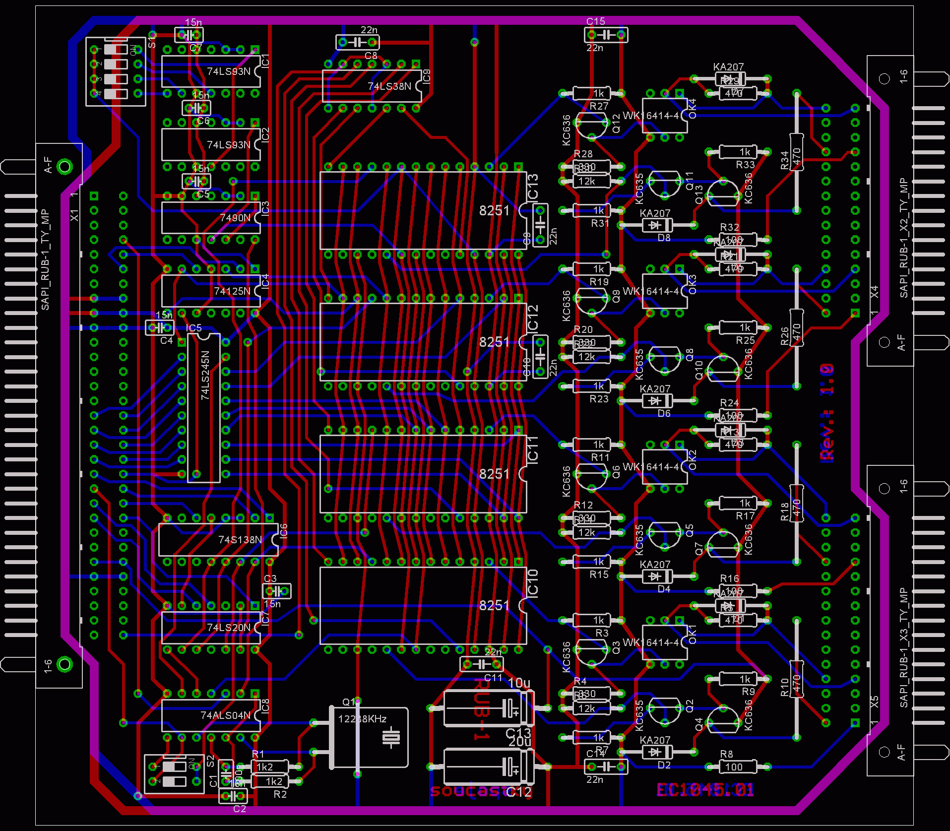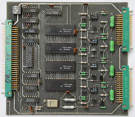Deska obsahuje 4x sériový port 8251 se společnými hodinami. Sériový přenos je řešen bez řídících signálů pomoci proudové smyčky oddělené optočleny. Pomocí přepínače S1 lze nastavit 4(8) přenosové rychlostí: