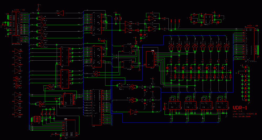 Výstup komparátoru D7A/6 oznámí úrovni log. "1" na výstupu A ≡ B, že na sběrnici je adresa navolená na desce UDR-1. Tento signál povolí vstup dekodéru adresových bitů A2, A3 /obvod 3205 D6A - vstup E3/ a současně přes hradlo 74132 D2A/3 povolí /CS zesilovačů dat - 3216 D4A a D5A.