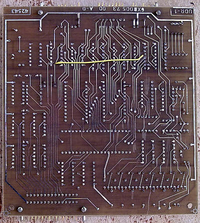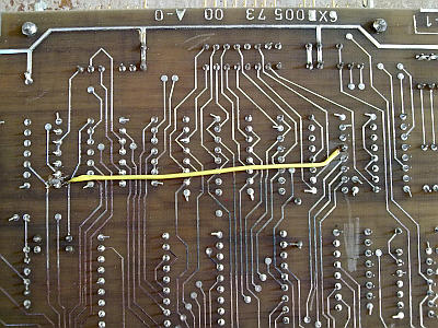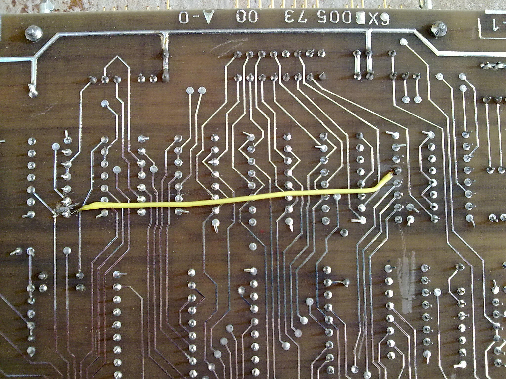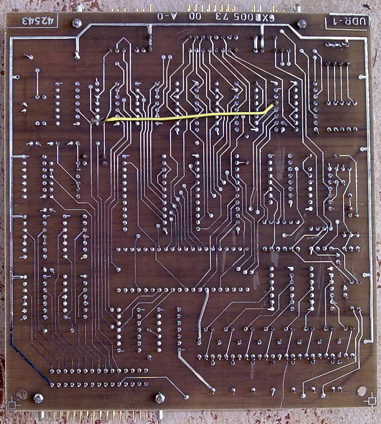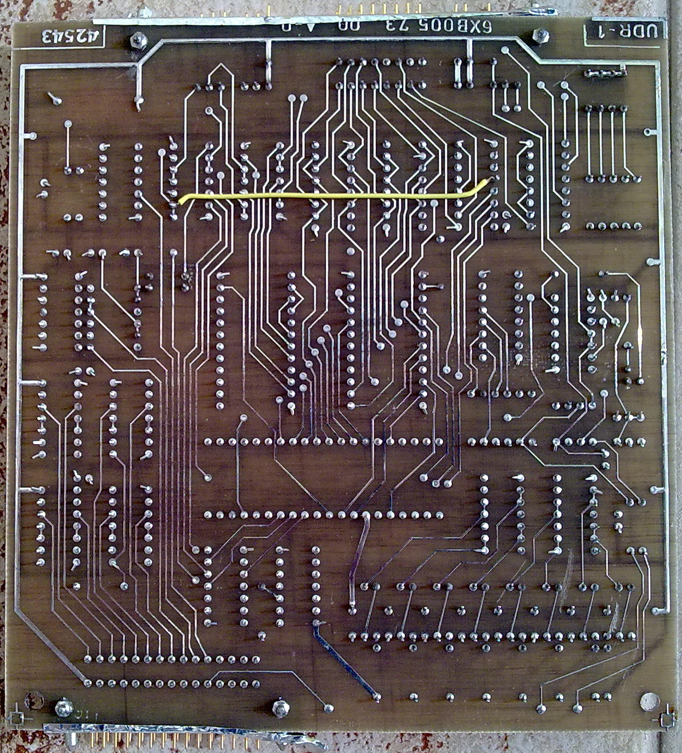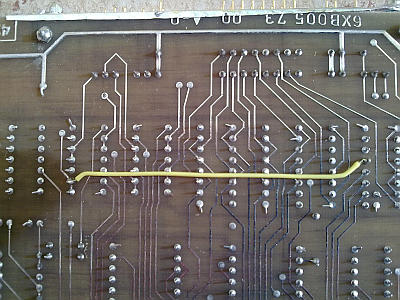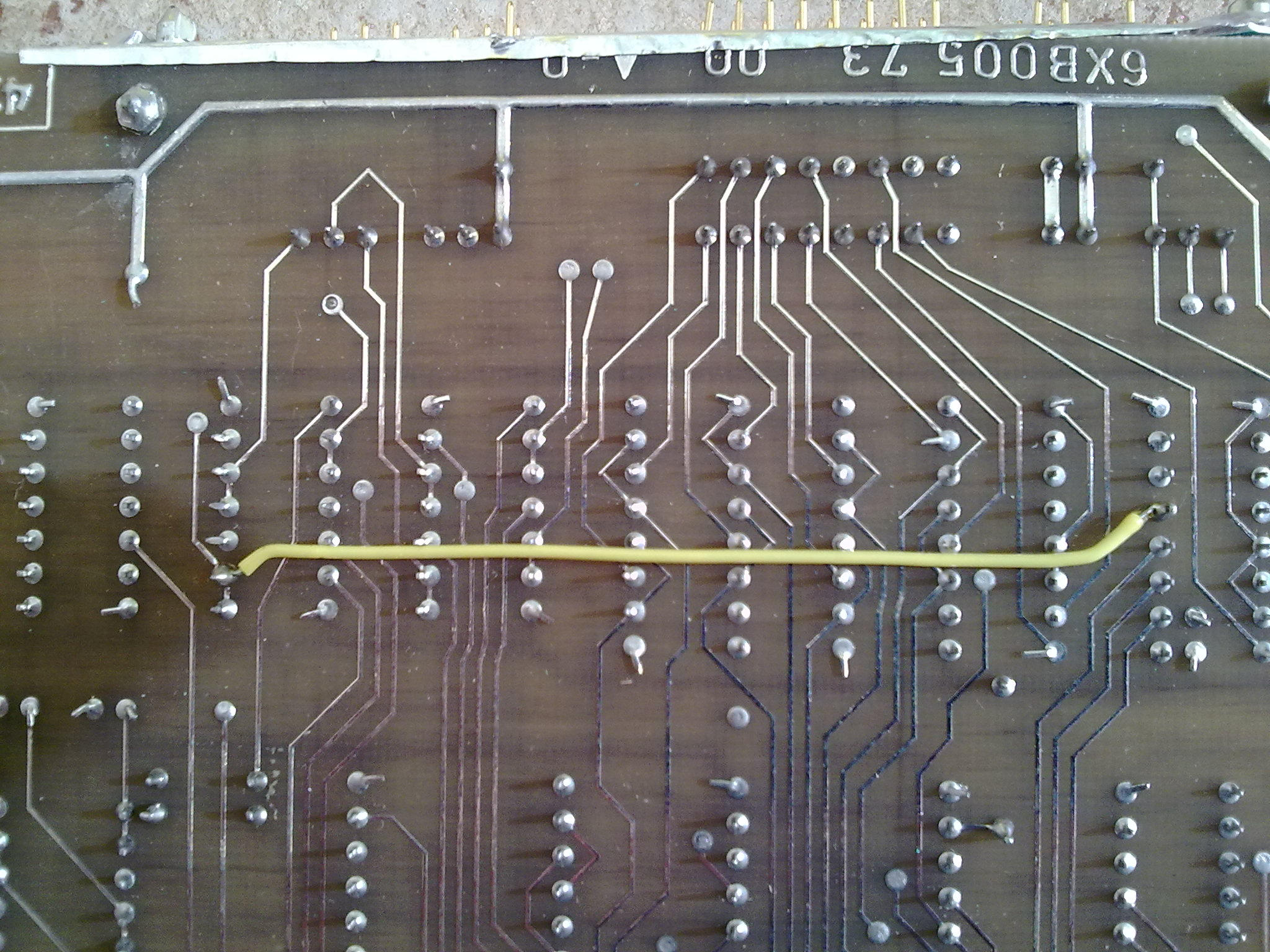 Při kontrole originál schématu vůči mnou zpětným inženýrstvím získanému schématu jsem objevil na ještě nepoužité desce zásadní závadu. Závada spočívá v tom že deska nejde adresovat. Na desce je drátový spoj odpovídací schématu, na překreslené desce je spoj již integrován do DPS. Drátový spoj se dodělával pravděpodobně až na hotové desce, kdy někdo odflákl svou práci a propojil výstup dekodéru 3205 D6A/12 (Y3) s jeho vstupem 6 (G1) a to na hradle 74132 D2A/1,2. Náprava spočívá v tom ze drátová propojka zakončená na hradle 74132 D2A se přepojí z vývodu 2 na vývod 1 pokut tam již není umístěna a spoj mezi vývody 1 a 2 ze strany pájení proškrábnout čímž se docílí stav odpovídající schématu a dokumentaci. U desek co jsem měl možnost zkontrolovat byla závada zjištěna u výrobních čísel 0402 a 0345, u výrobních čísel 0043, 0057, 0053 a 0176 je úprava provedena správně.