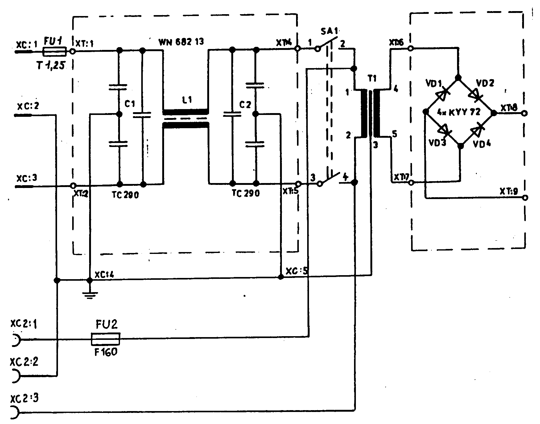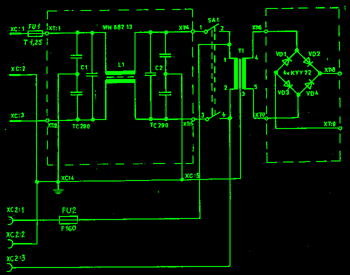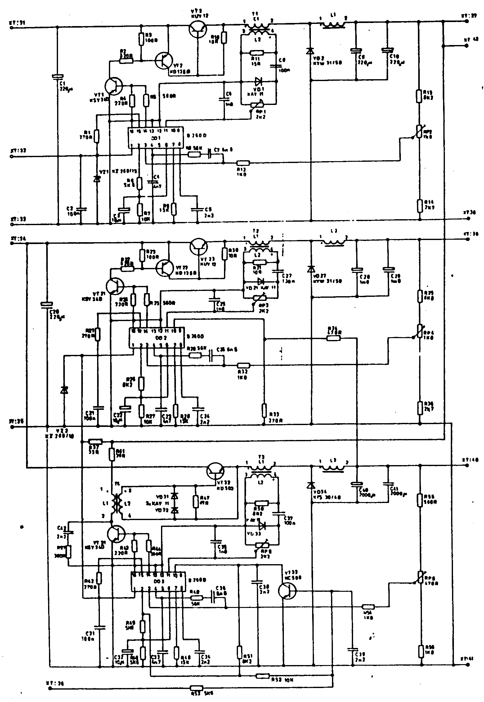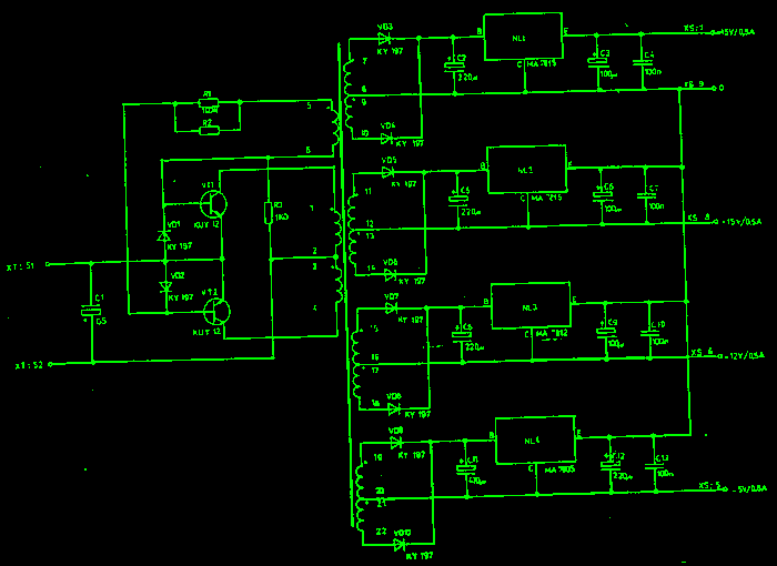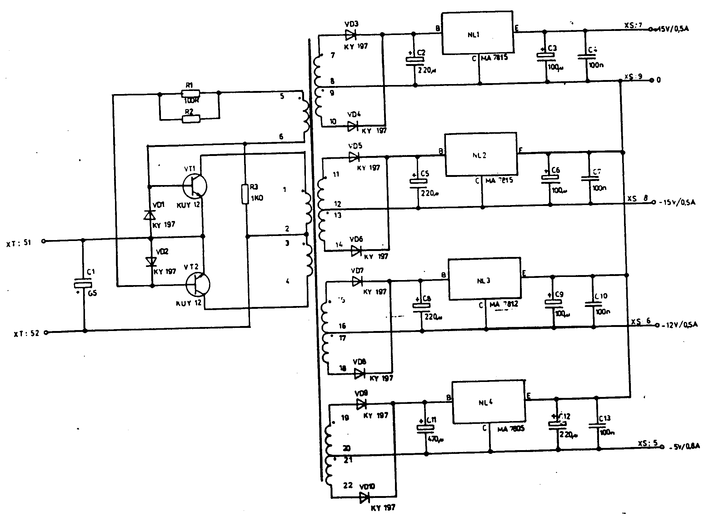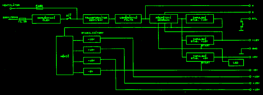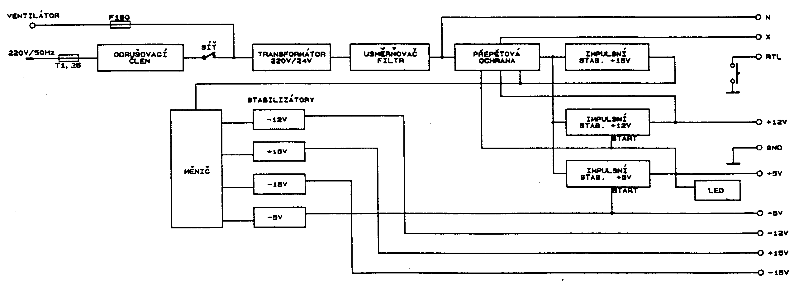 Sítové napětí je převedeno na hodnotu 24 V transformátorem T1, který zároveň zajišťuje bezpečnostní, oddělení sekundárních obvodů od rozvodu 220 V. Sekundární napětí 24 V je usměrněno a filtrováno . Takto upravené napětí se přivádí na spínané stabilizátory výstupních napětí +15 V, +12 V a +5 V. Hladina +15 V nabíhá jako první a napájí měnič s výstupními napětími -5 V, -12 V a ±15 V. Teprve přítomnost napětí -5 V na výstupu odblokuje stabilizátor hladiny +5 V a toto napětí uvolní činnost stabilizátoru +12 V. Spínané stabilizátory jsou řízeny obvody B260D (TDA 1060), výstupní napětí měniče jsou stabilizována třísvorkovými monolitickými stabilizátory řady MA 78xx.
