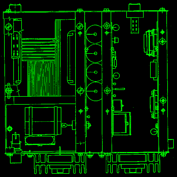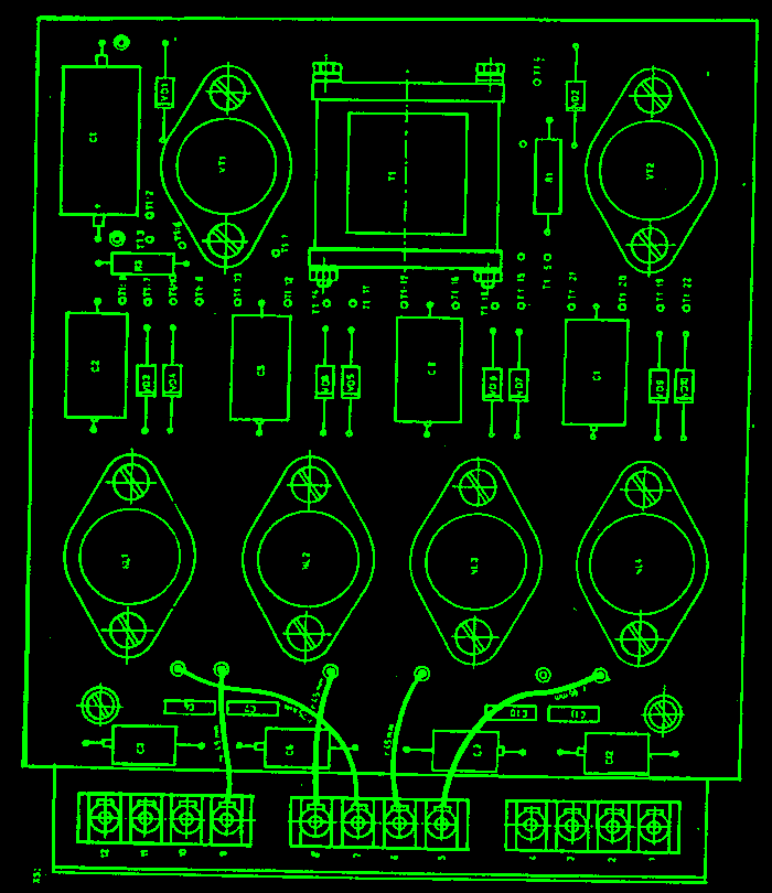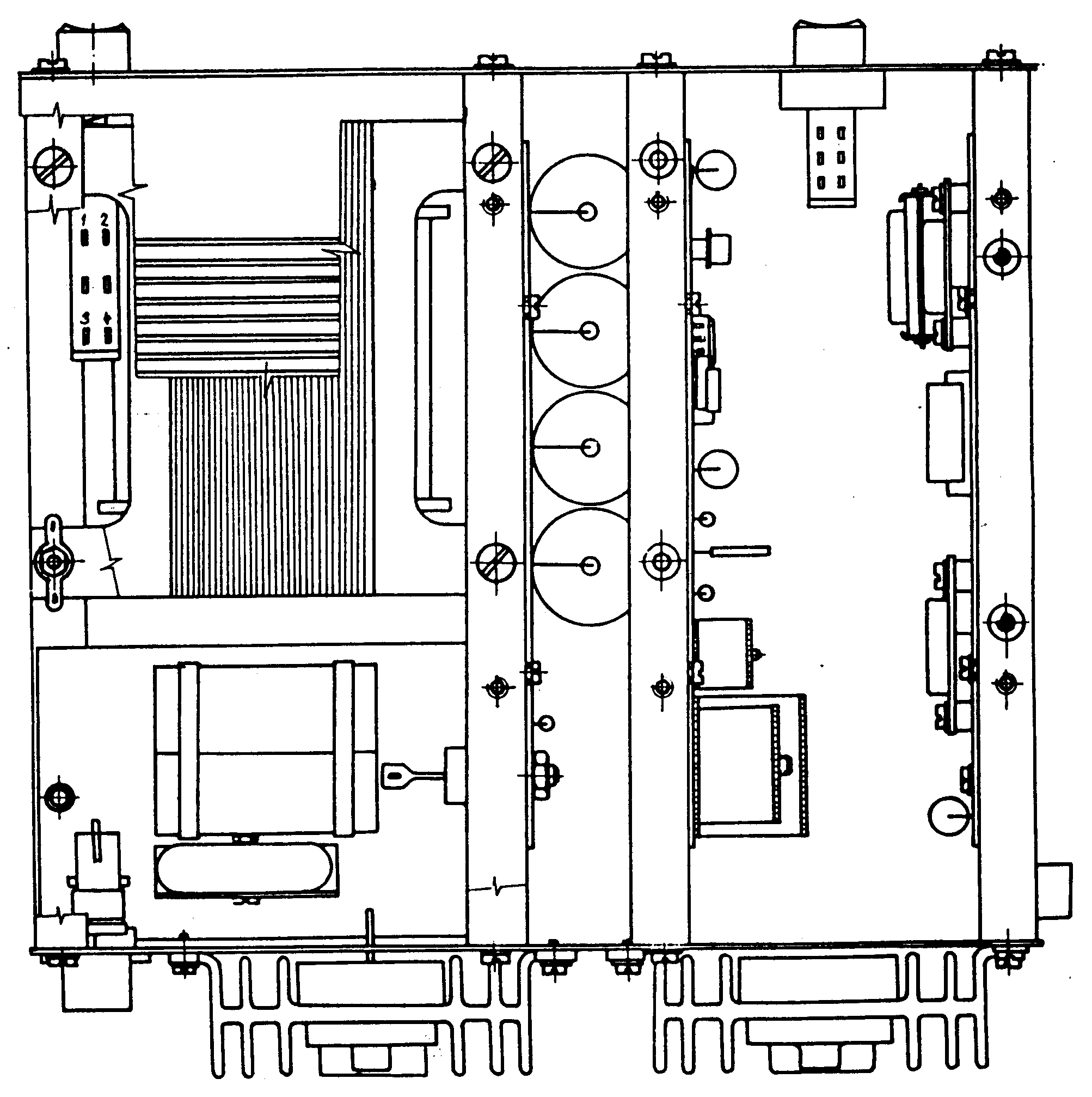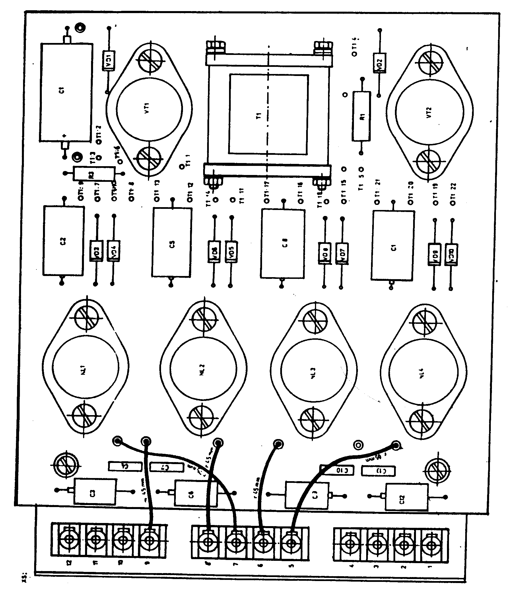 Usměrňovač sekundárního napětí 24 V a výkonové tranzistory jsou umístěny na chladiči, který je připevněn k zadnímu panelu zdroje.