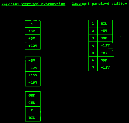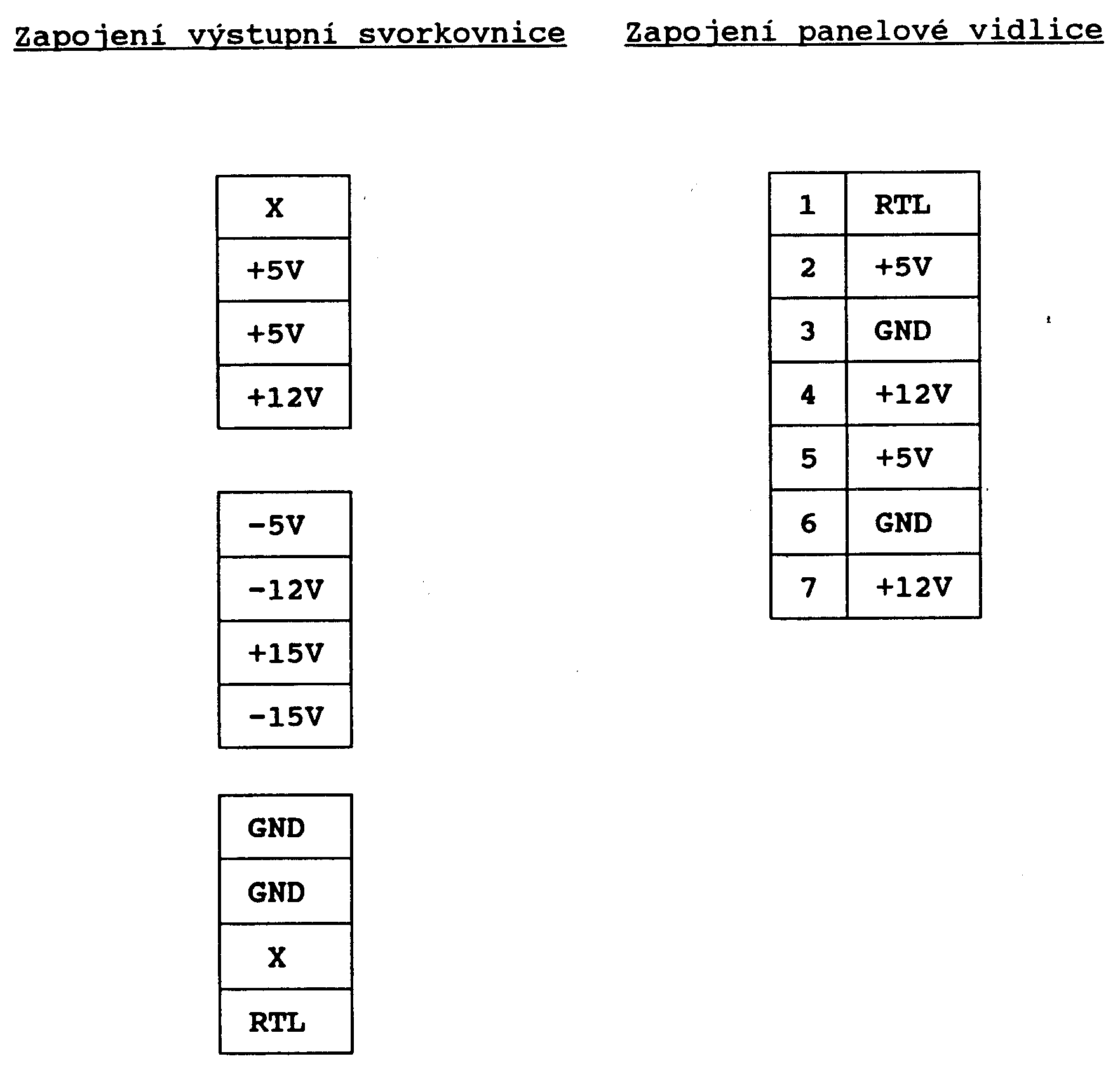 Jednotlivá výstupní napětí jsou přivedena na svorkovnici umístěnou na zadní stěně zdroje. Na tuto svorkovnici jsou také vyvedeny tři zvláštní signály :