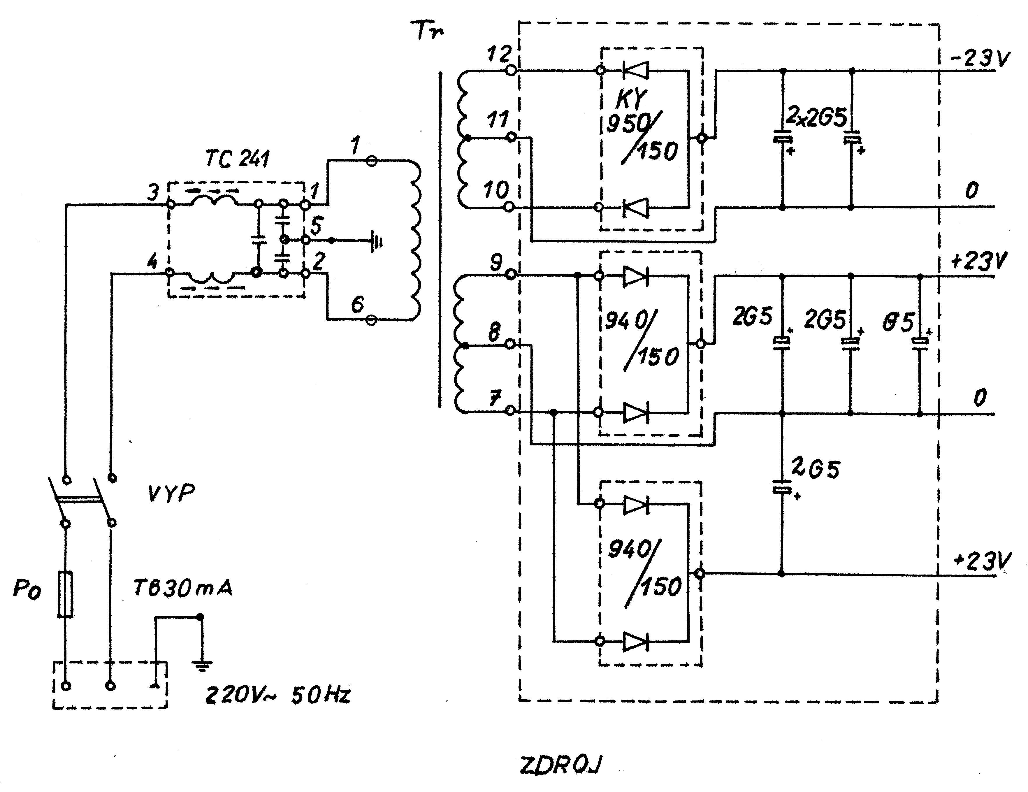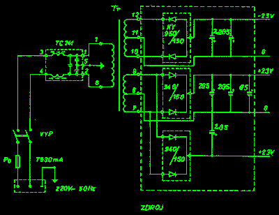 Zdroj stolného počítača je osadený 60 W transformátorom, ktorý je navinutý na jadre C - 2 000 4. Primárna časť transformátoru je napájaná cez filtračný kondenzátor TC 241, ktorý sa používa na odrušenie. Poistka PO je T - 630 mA. Doska plošného spoja usmerňovača je osadená modernými súčiastkami rady KY, dvojicami diód 950, 940.